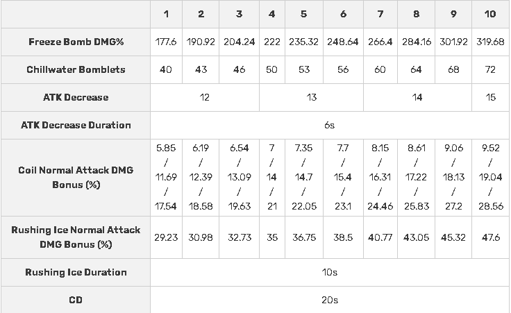 | Thundering Pulse R1 (5*) | 127.18% | Base Attack: 608 CRIT DMG: 66.2% | BiS. CRIT DMG is valuable for Freeze. |