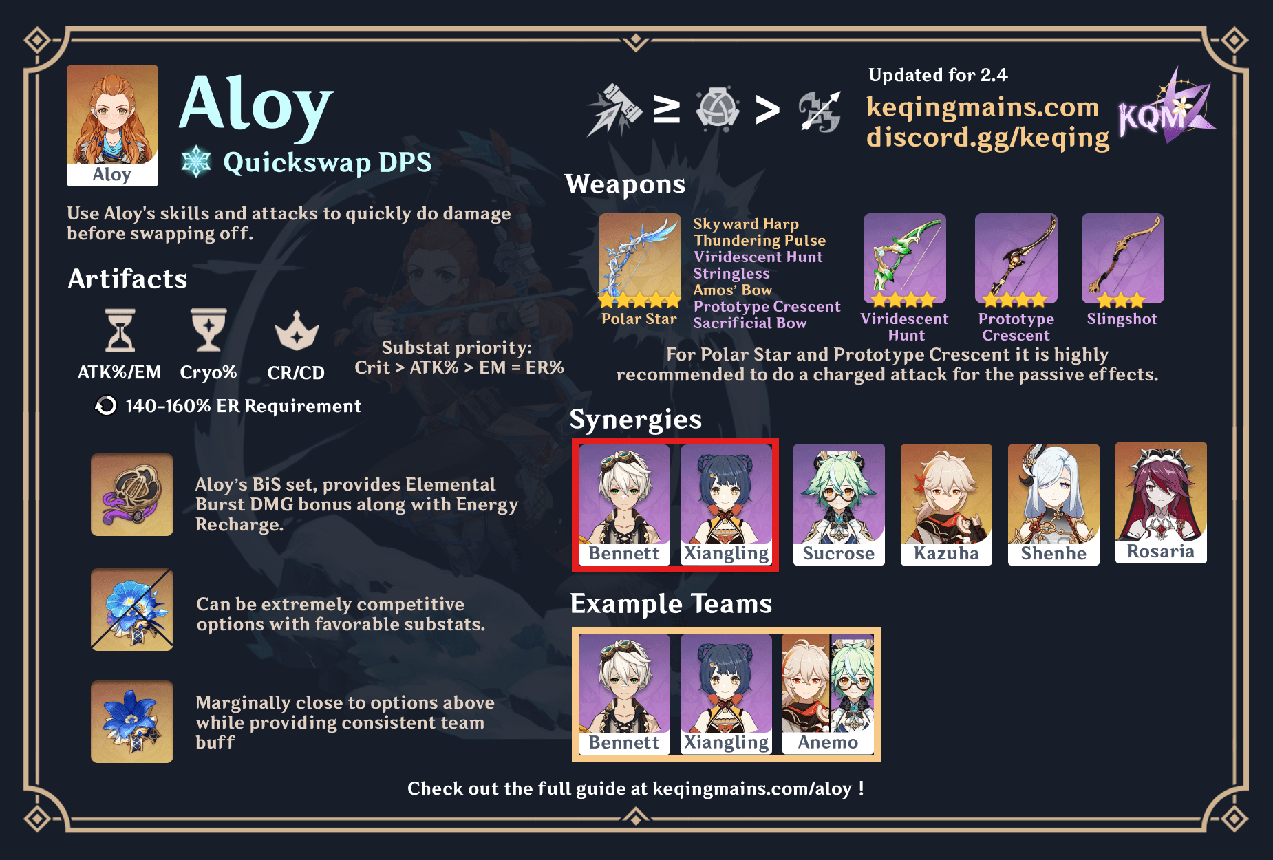 Example rotation (with flex slot as Sucrose): Bennett Q > Sucrose 1 E + Q (for Xiangling Pyro VV) > Xiangling Q > Aloy E > Sucrose E (to group bombs and VV) > Aloy N4 (to stack some Cryo damage bonus from Aloy’s A4) > Aloy Q