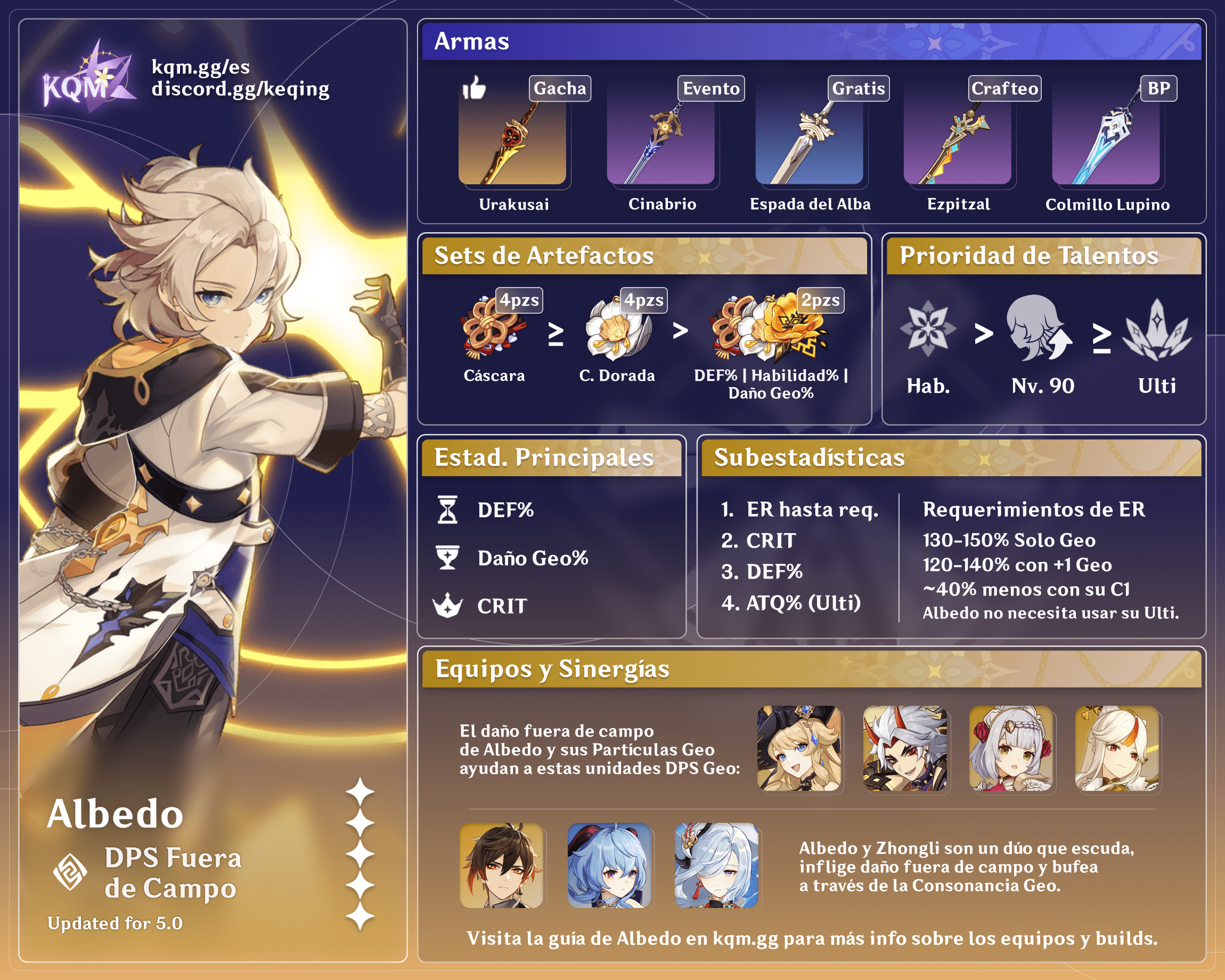Albedo es un personaje Geo de espada 5 estrellas en Genshin Impact que se especializa en infligir daño Geo constante fuera del campo de batalla. Aprende sobre las mejores builds de Albedo, la prioridad de talentos, las mejores armas, los mejores artefactos y los mejores equipos en esta guía rápida.