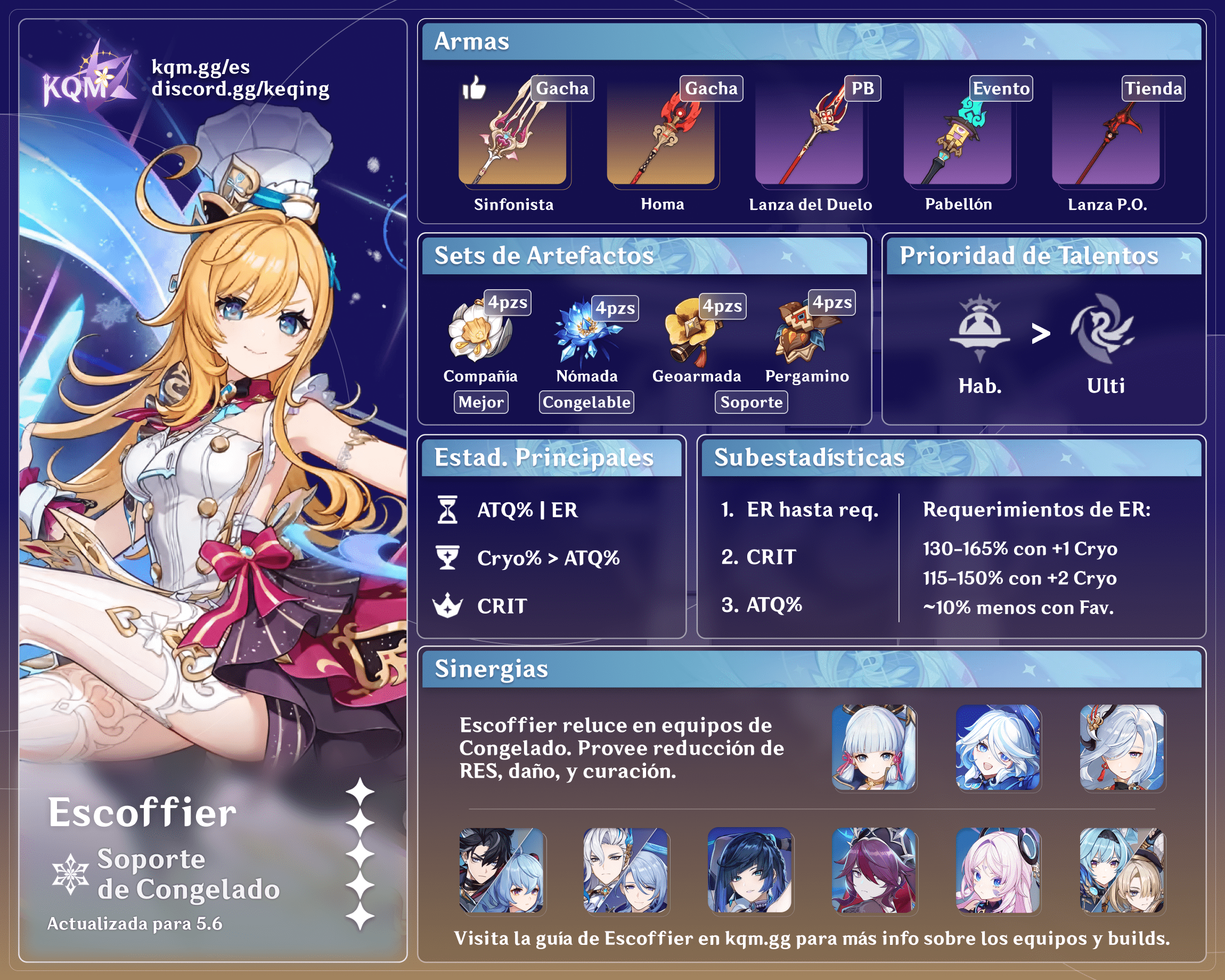 Escoffier es un personaje Cryo 5★ de Lanza en Genshin Impact quien contribuye daño fuera de campo, reducción de RES Cryo e Hydro, y curaciones. Aprende acerca de las mejores builds, armas, artefactos y equipos de Escoffier en esta guía.