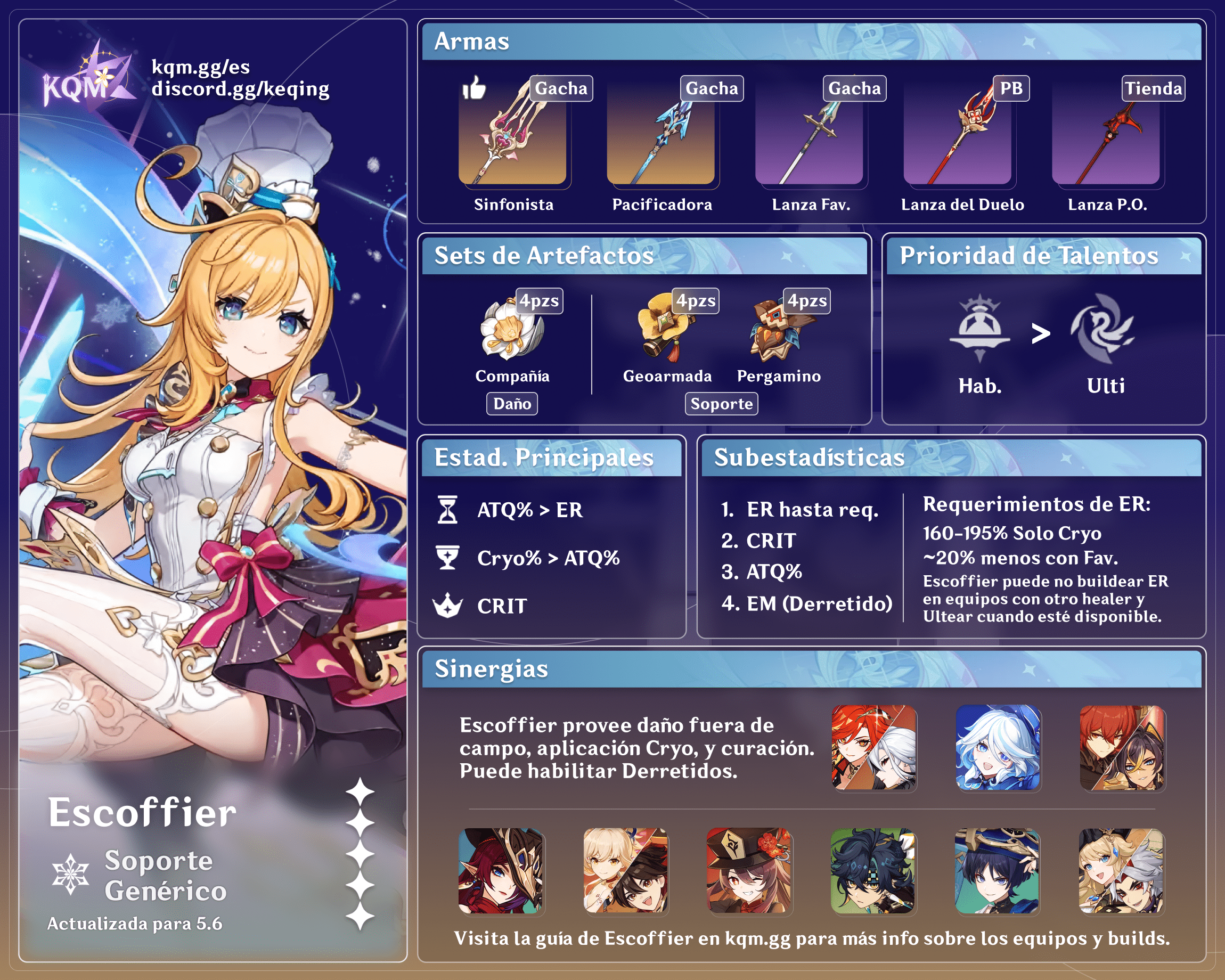 ![]() Eula | Si bien el daño de Eula es sobre todo Físico, Escoffier puede aprovechar la reducción RES Cryo de Eula para amplificar su propio daño. Ella también provee curación para potenciar la algarabía en composiciones de Eula con Furina. Para reducir aún más los requerimientos de ER de Eula, se recomienda con creces el uso de una tercera opción Cryo como Rosaria, Shenhe, o Mika. |