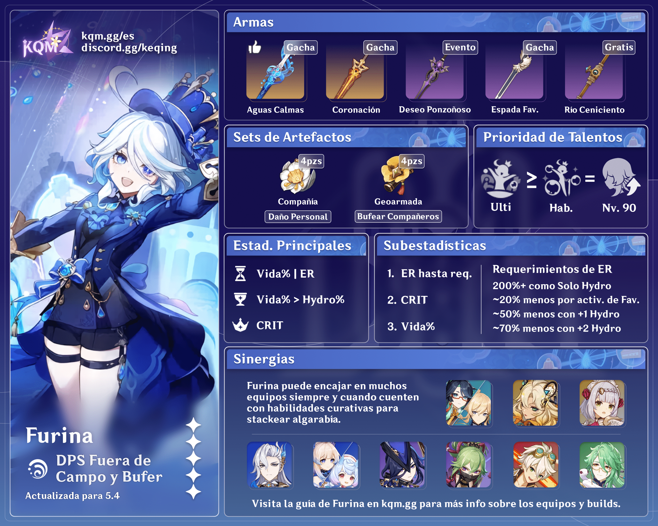 Furina es un personaje Hydro Espada 5 estrellas en Genshin Impact que proporciona un fuerte daño fuera del campo de batalla, mejoras para todo el equipo y mecánicas únicas de manipulación de la Vida del equipo. La Arconte Hydro roba el protagonismo incluso como un soporte fuera del campo, con sus equipos enfocados en torno a su conjunto de habilidades. Aprende sobre las mejores builds de Furina, las mejores armas, los mejores artefactos y los mejores equipos en esta guía.