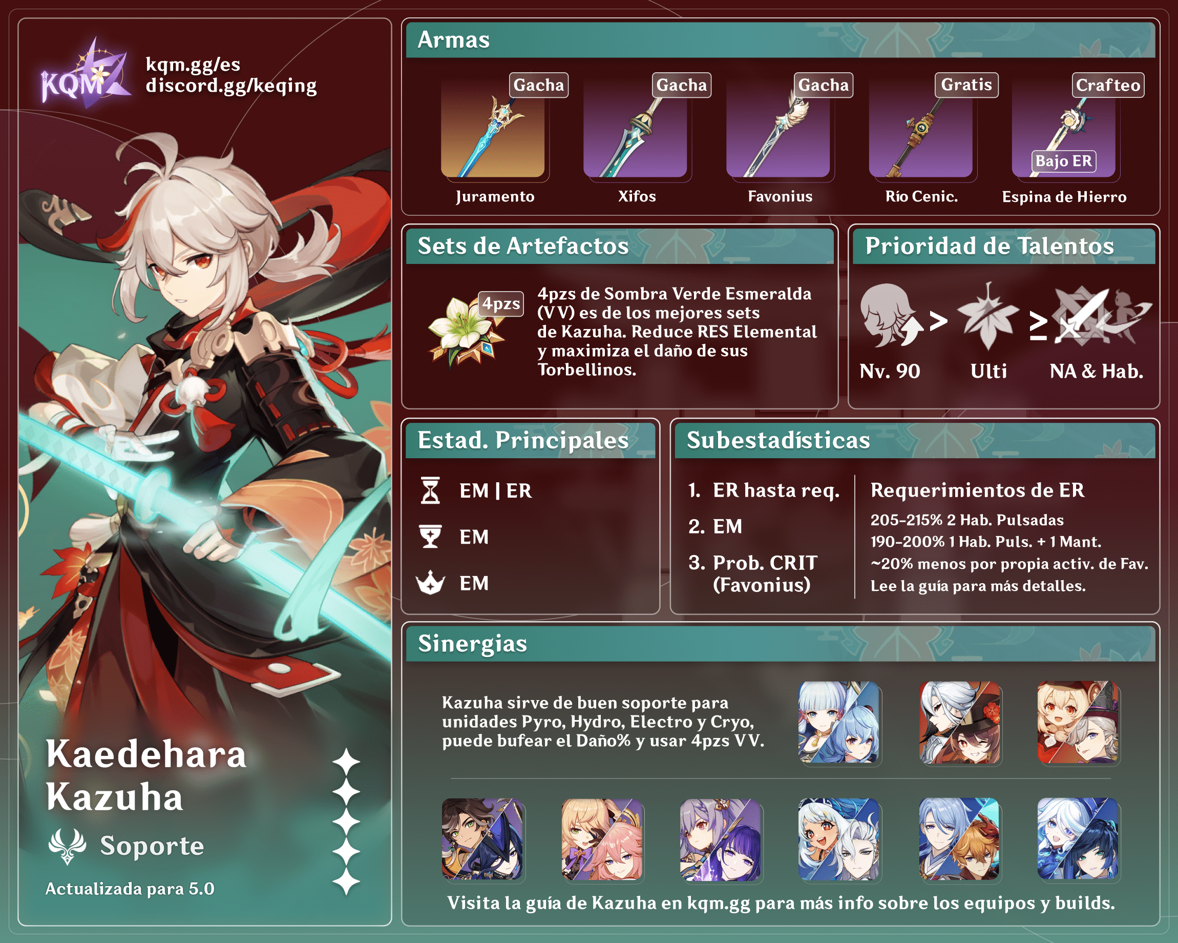 Kazuha es un personaje Anemo de espada de 5 estrellas que provee control de masas, bufos al equipo, y aplicación Elemental. En esta guía vas a aprender sobre sus mejores builds, armas, artefactos, y equipos.