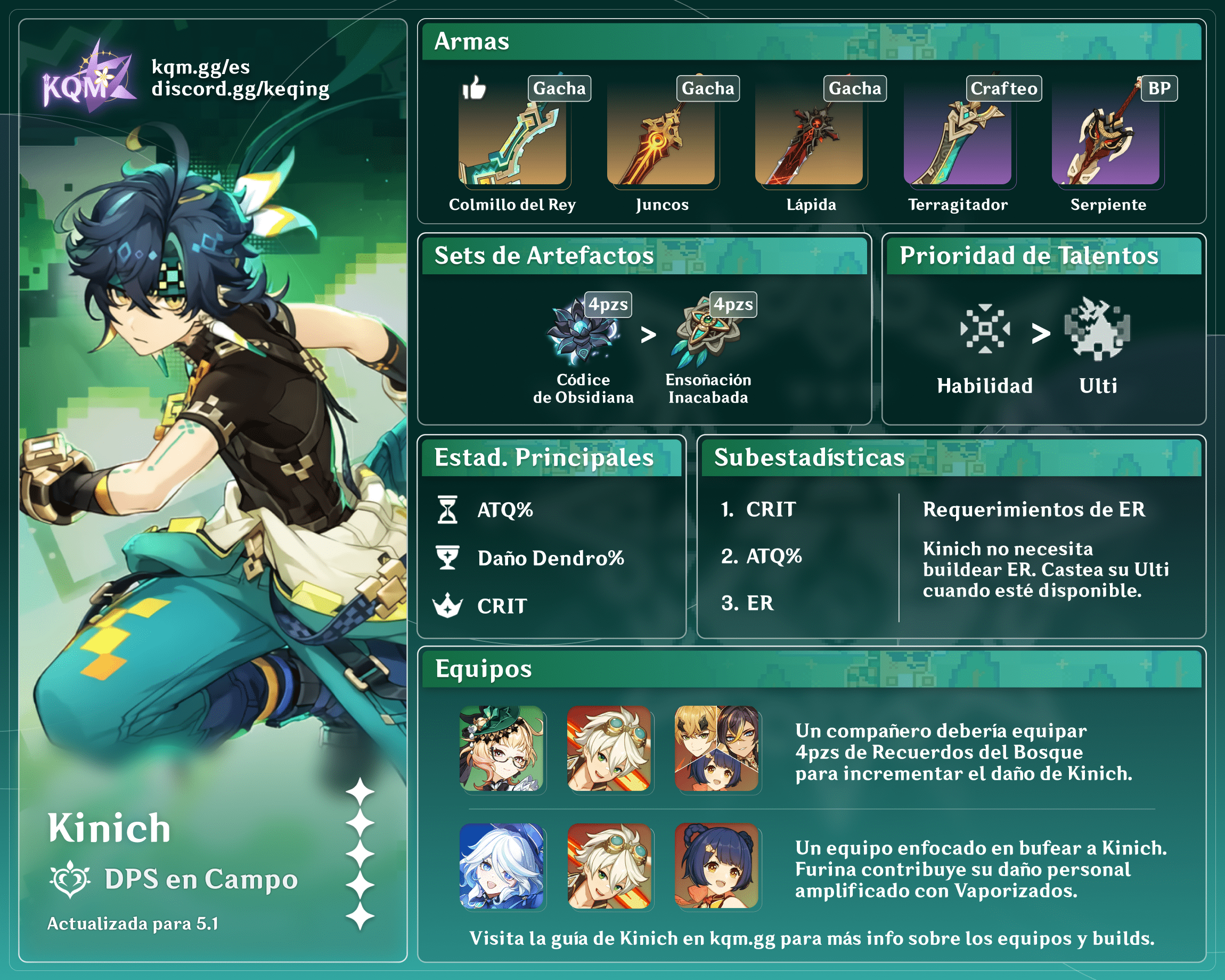 4pzs Recuerdos del Bosque | Este set no se recomienda usar en Kinich, ya que se aprovecha mucho más si otro miembro del equipo es el portador. Usar 4pz de Códice de Obsidiana es mejor para su daño, incluso si eso significa no contar con Recuerdos del Bosque en el equipo. |