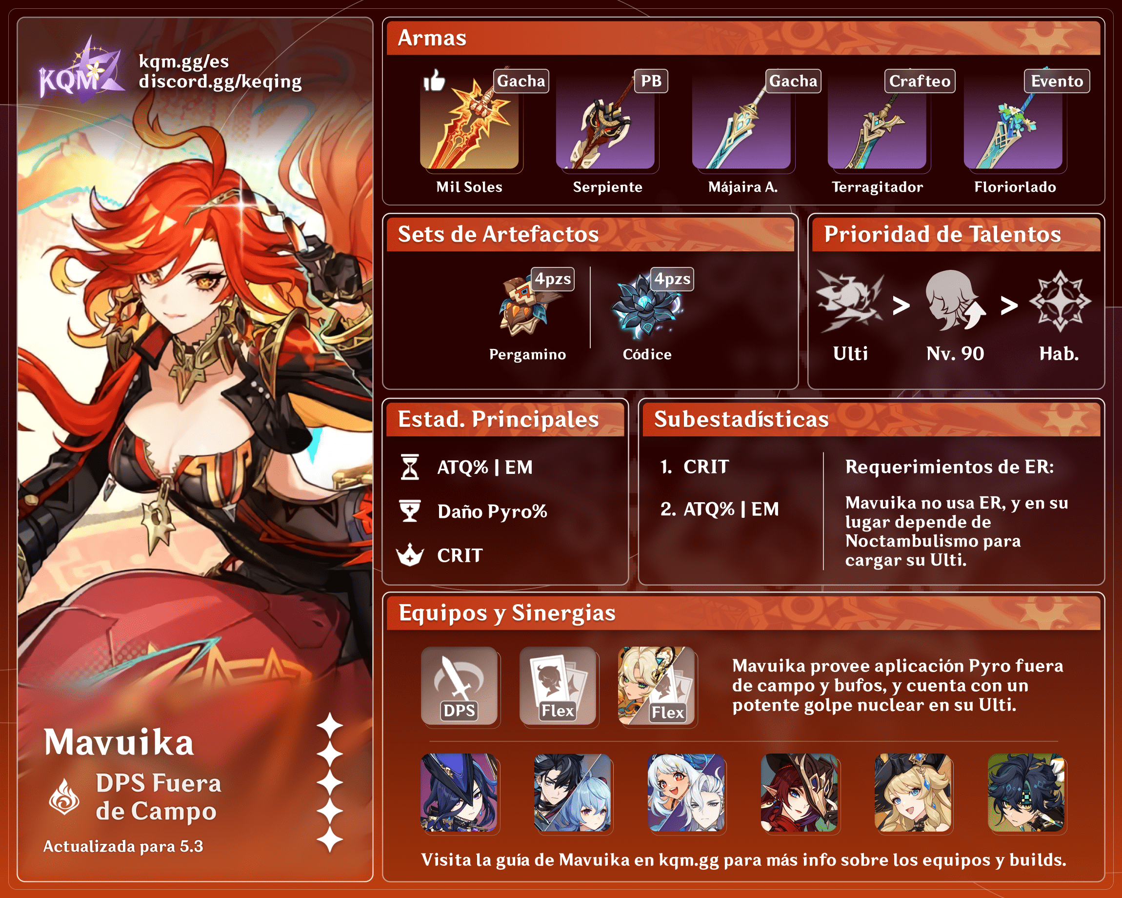 La Habilidad de Mavuika le permite jugar como un habilitador de Pyro fuera de campo, por fin otorgándole a los jugadores una alternativa para aquellos quienes tuvieron suficiente de lidiar con los insaciables requerimientos de ER de Xiangling. También aporta fuertes bufos: Mavuika puede sostener 4pzs de Pergamino por su poderoso Bono de Daño%, y encima de eso su Ulti provee un Bono de Daño que disminuye.