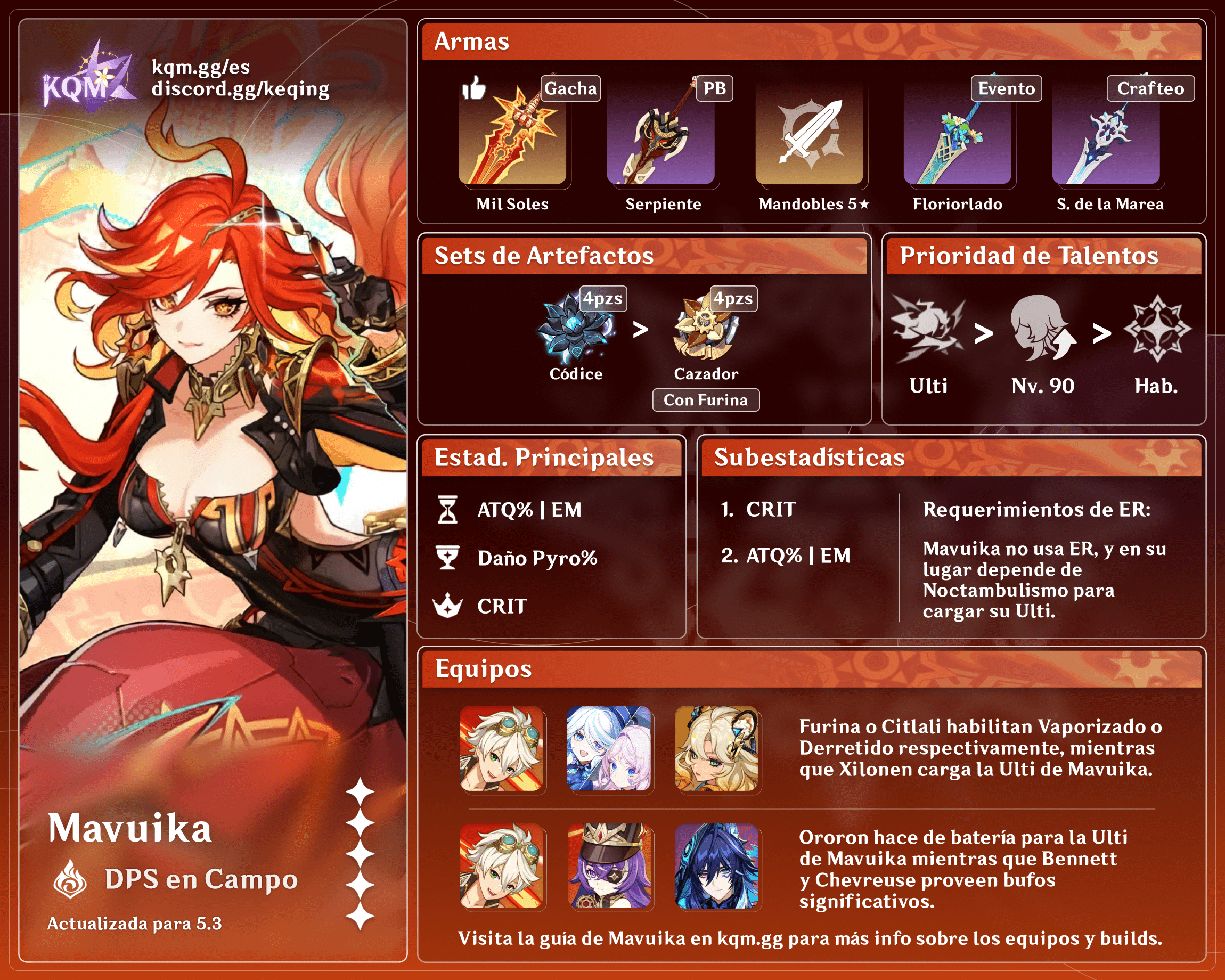 Aparte de habilitar Derretidos o Vaporizados, Mavuika puede jugarse con un DPS Electro de campo en equipos de Chevreuse, o en composiciones de Quemadura / Crepitar con Kinich. Puede también ser un simple atacante fuera de campo en equipos de Mono Pyro.