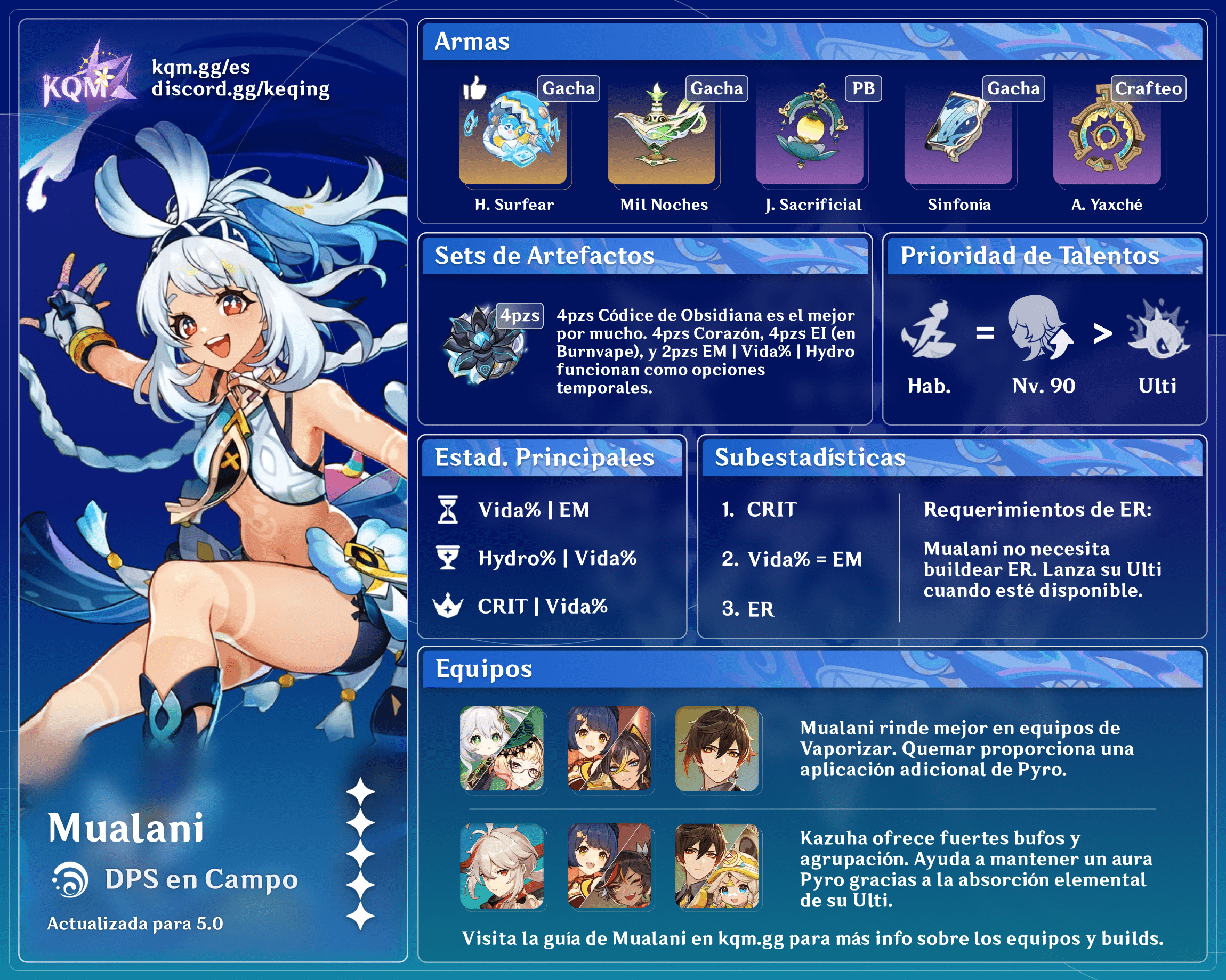 Ten en cuenta que a pesar de que la construcción de equipo de Mualani es relativamente flexible, esto se debe a que carece de aliados dedicados hasta la 5.0. En cambio, sus equipos pueden ir con cualquier soporte que esté disponible e incluir algún DPS fuera de campo (por ejemplo Chiori o Émilie) que pueda contribuir al daño del equipo.