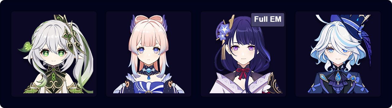 ![]() Xingchiu | ![]() Yelan | ![]() Neuvillette | ![]() Ayato | ![]() Candace | ![]() Furina |