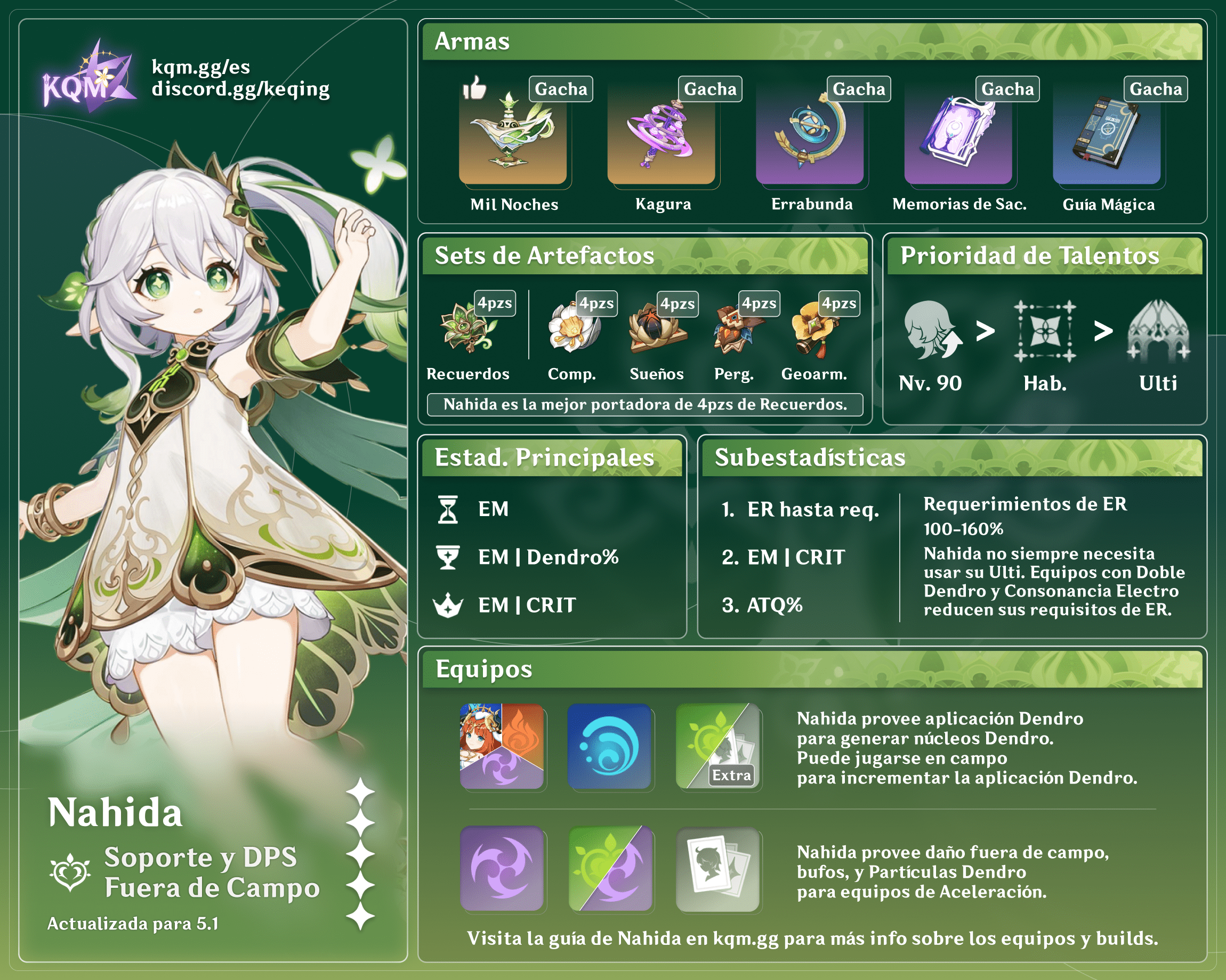 Nahida es un personaje Dendro con catalizador 5 estrellas que proporciona una aplicación y daño Dendro consistentes y frecuentes, tanto en el campo como fuera de él, con un enfoque fuerte en las reacciones elementales Dendro. Aprende sobre las mejores builds, armas, artefactos y equipos para Nahida en esta guía rápida.