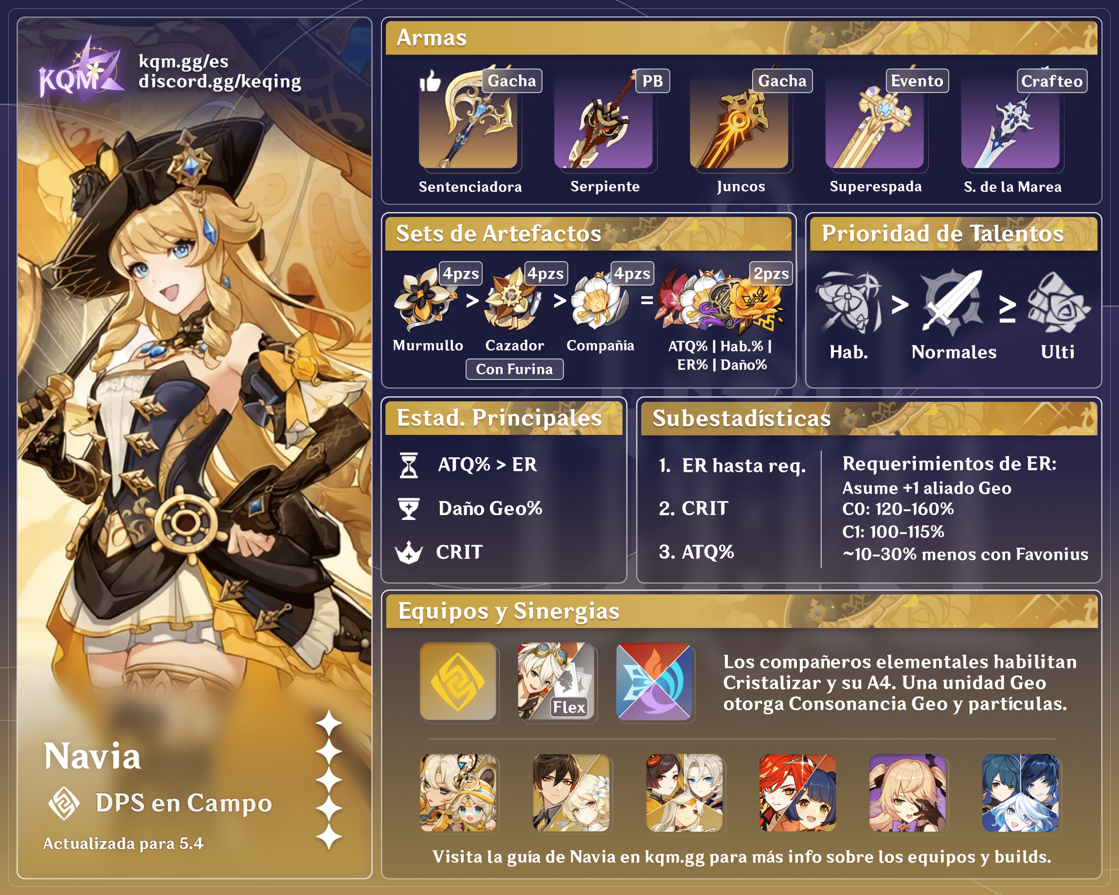Navia funciona mejor con una build estándar de ADC (Ataque, Daño Elemental, Crítico) — Reloj de ATQ%, Cáliz de Daño Geo% y Tiara de CRIT. Si no puedes alcanzar los requerimientos de ER% de Navia con las subestadísticas, está bien llevar un Reloj de ER%.