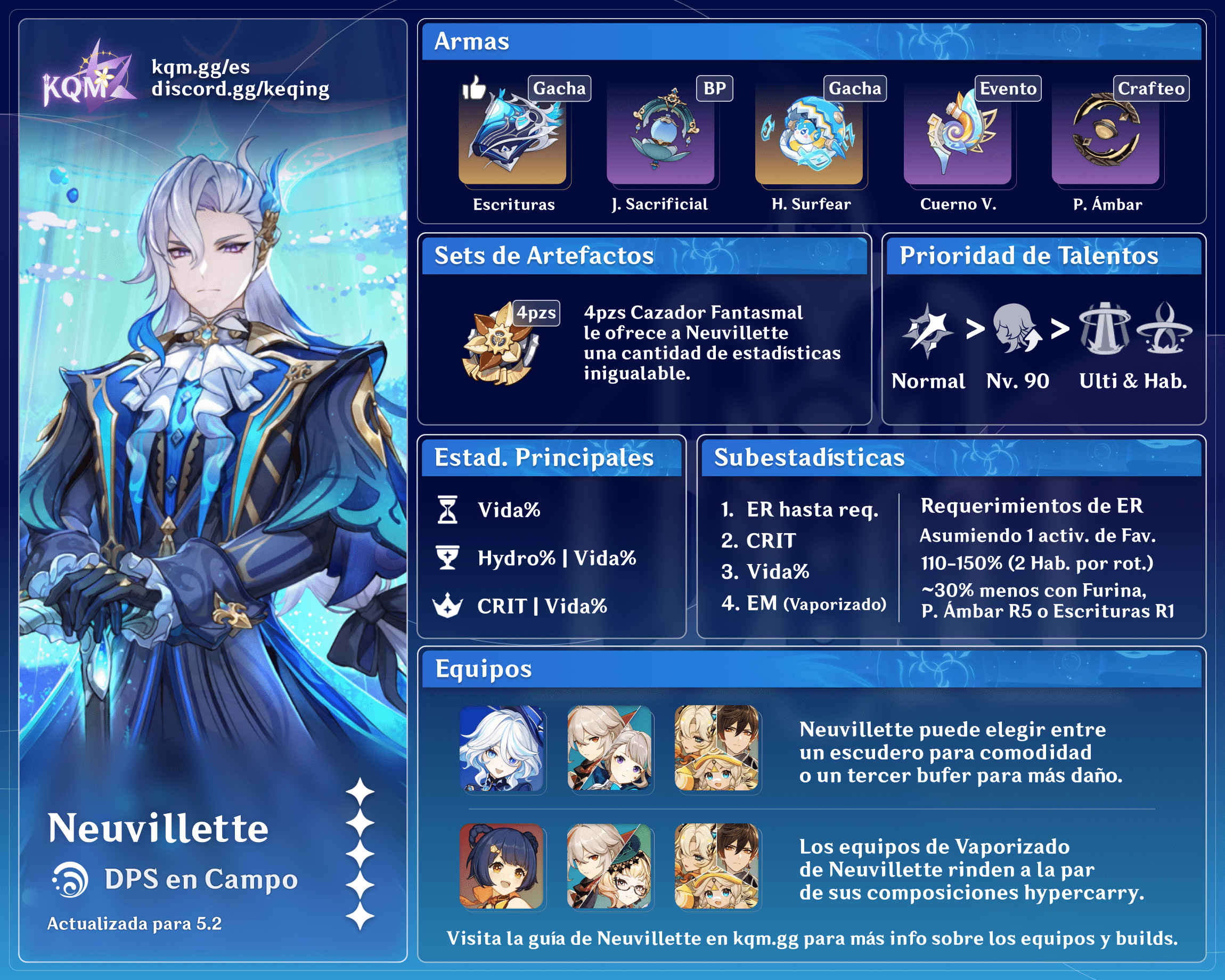 Neuvillette es un personaje Hydro Catalizador 5 estrellas en Genshin Impact que Inflige daño a través de sus Ataques Cargados Potenciados con su estilo de juego en campo. Infórmate sobre las mejores composiciones de equipo, armas, artefactos, y builds de Neuvillette en esta guía.
