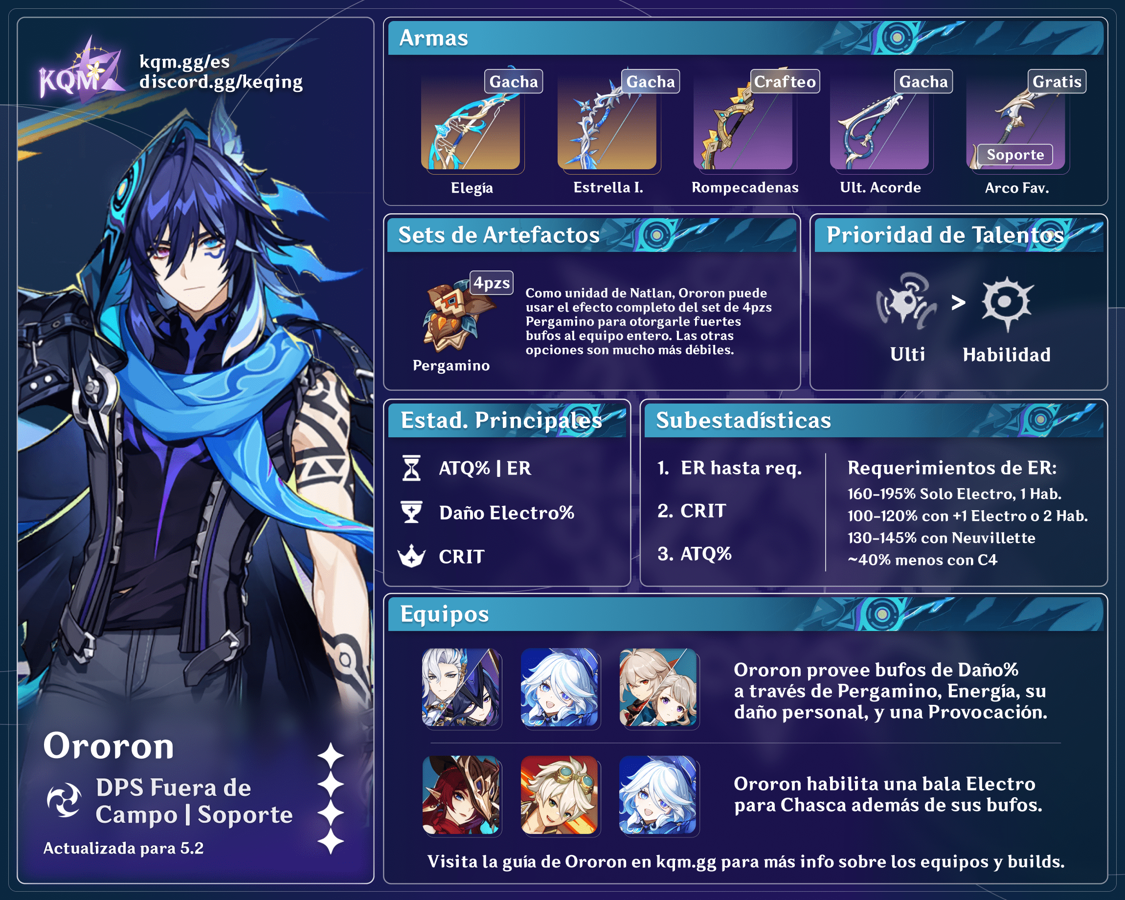 Ororon puede ver uso en equipos que involucren Electrocargado y/o daño de naturaleza noctámbula. Sigue el típico combo de Habilidad > Ulti > Cambio y realiza todo su daño desde fuera del campo.