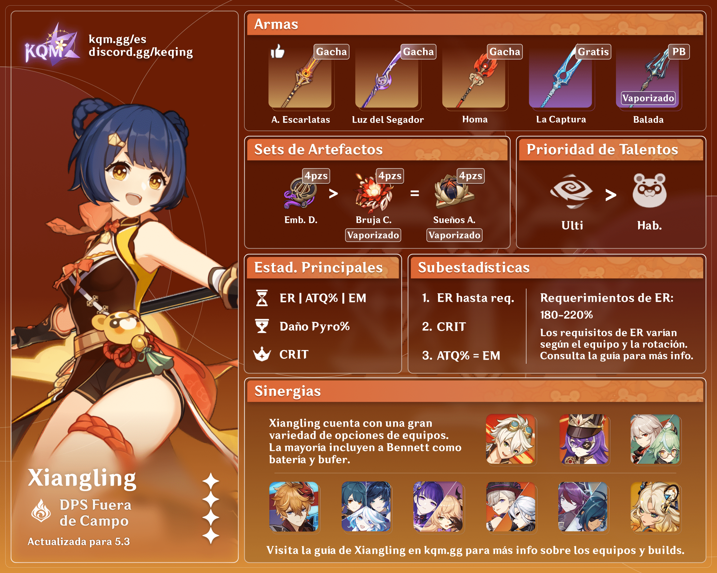 Los Requerimientos de ER de Xiangling varían bastante dependiendo del equipo. Canalizar la Energía Pyro de las partículas generadas por la Habilidad de Bennett hacia Xiangling ayuda de forma enorme en aliviar sus requisitos de ER. La Cruz de Kitain y la Lanza de Favonius también son opciones de arma fantásticas para ayudar a que alcance sus requerimientos de ER.