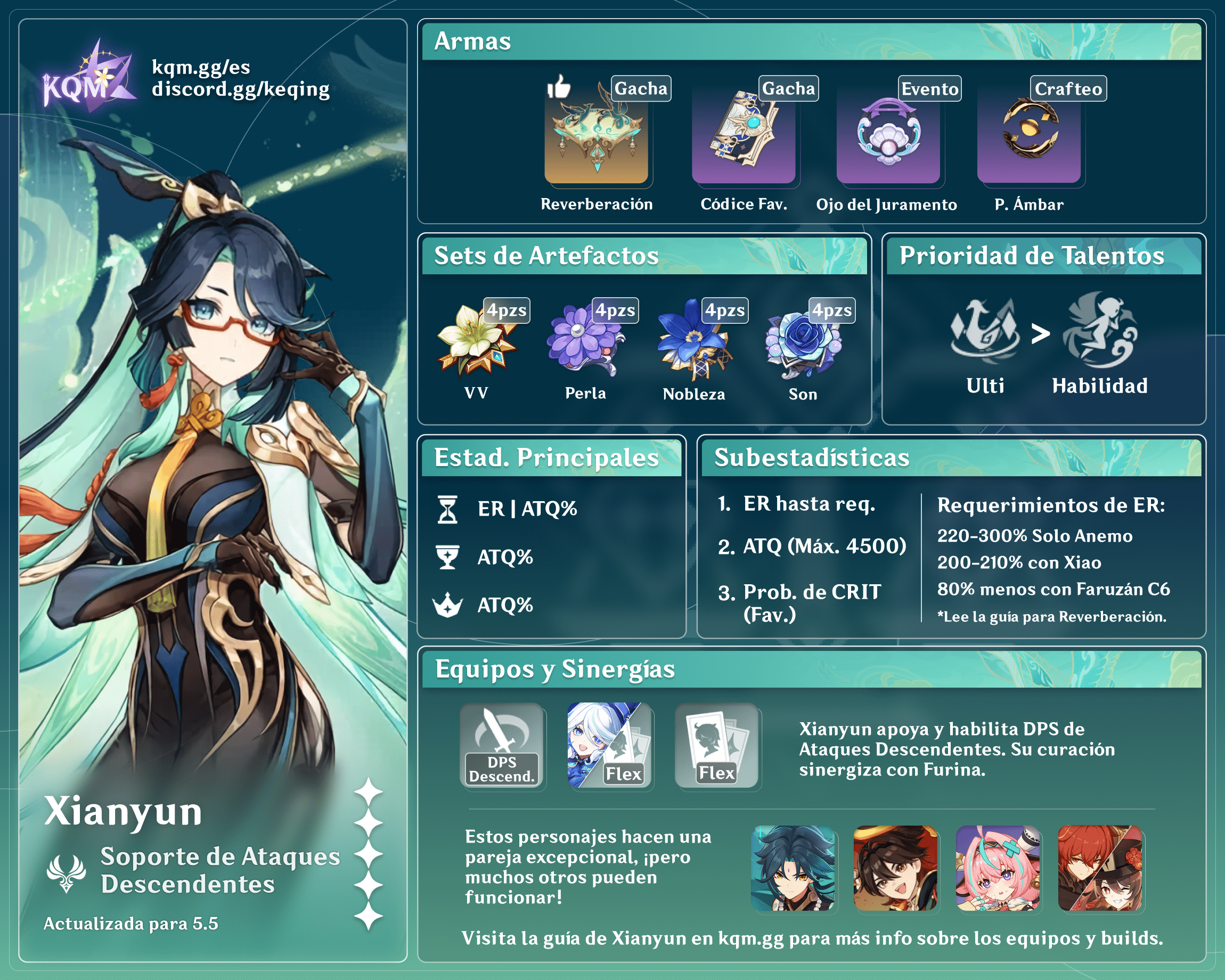 Xianyun es un personaje 5–estrella Anemo de Catalizador en Genshin Impact quien habilita un estilo de juego DPS a Ataques Descendentes, otorga un bufo de Ataque Descendente, y provee una fuerte curación de equipo completo. Aprende acerca de las mejores builds, armas, artefactos y equipos de Xianyun en esta guía.