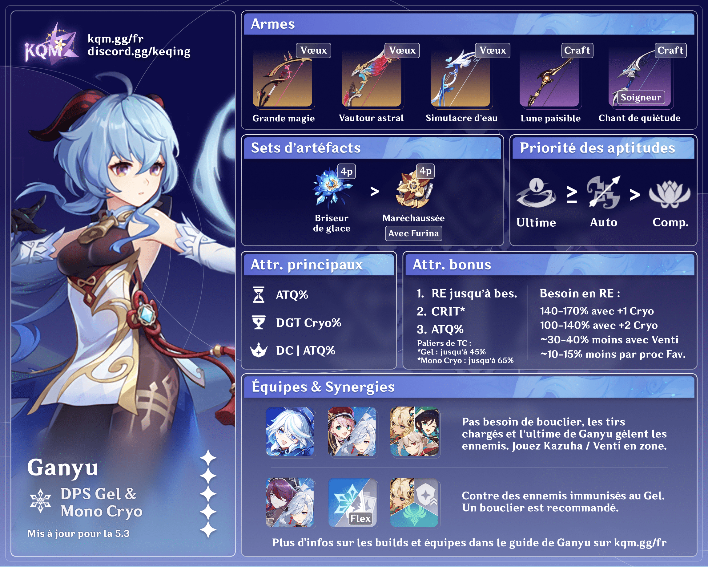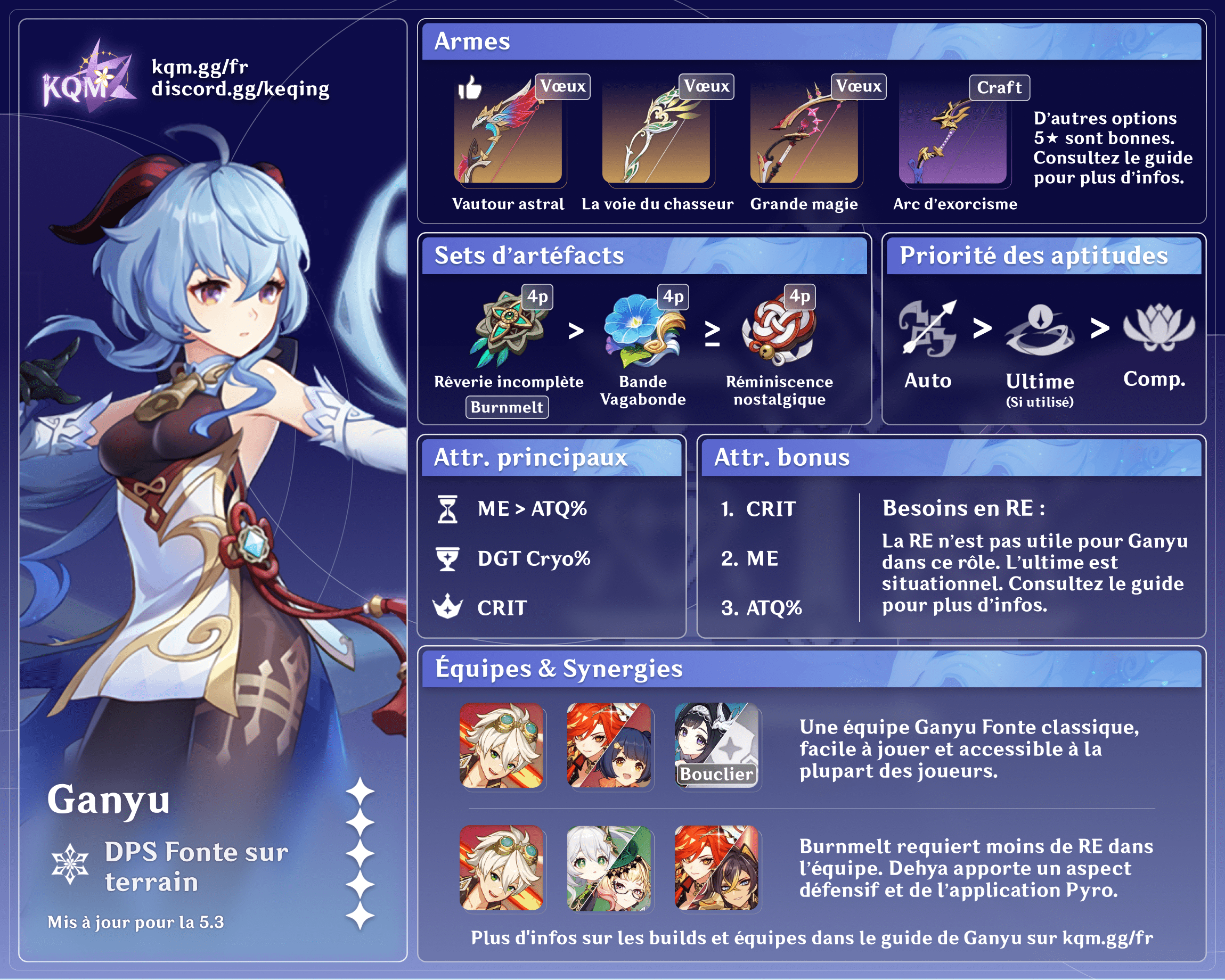 Ganyu est un personnage 5 étoiles maniant un arc qui fait beaucoup de dégâts régulièrement avec ses attaques chargées et son déchaînement élémentaire. Elle peut être jouée dans divers archétypes et styles. Ce guide propose une vue d’ensemble des styles de jeu de Ganyu, ses aptitudes et constellations. Ses meilleurs artéfacts, armes, et équipes sont séparés en deux sections : Gel & Mono Cryo et Fonte.