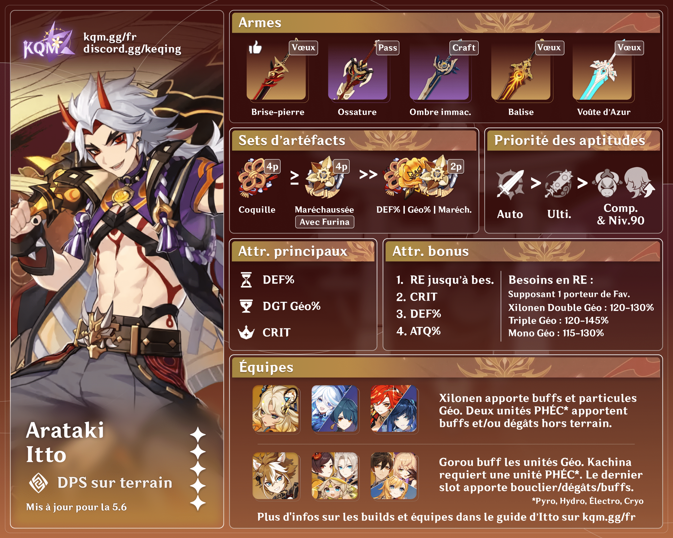 ![]() Mille soleils brûlants, Croc du roi de la montagne | Les armes signatures de Mavuika et Kinich ne sont pas recommandées pour Itto, et arriveront le plus souvent à la hauteur de l’Ombre immaculée R5. |