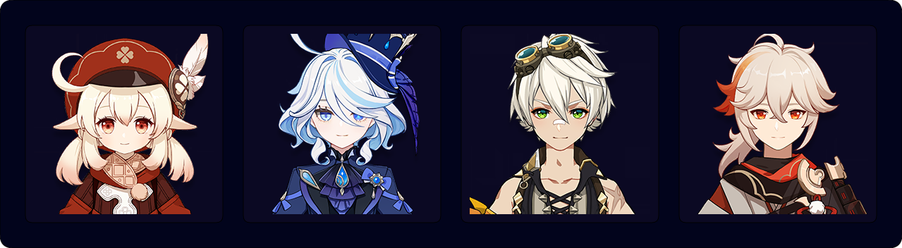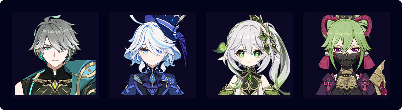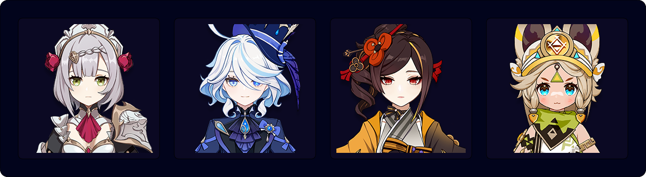 ![]() Baizhu | ![]() Yaoyao | ![]() Kuki Shinobu | ![]() Prototype Amber | ![]() Nahida | Ororon |
