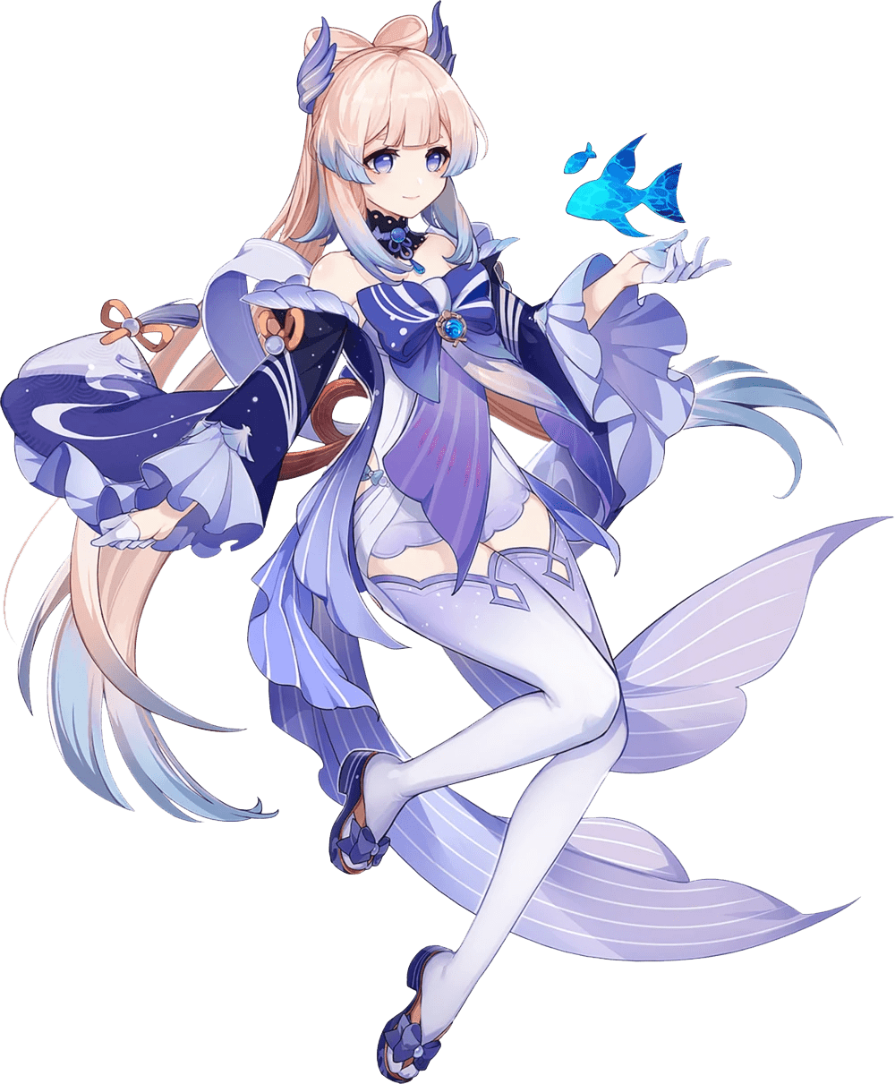 While donning the Ceremonial Garment created by Nereid’s Ascension, the final Normal Attack in Sangonomiya Kokomi’s combo will unleash a swimming fish to deal 30% of her Max HP as Hydro DMG. This DMG is not considered Normal Attack DMG.
