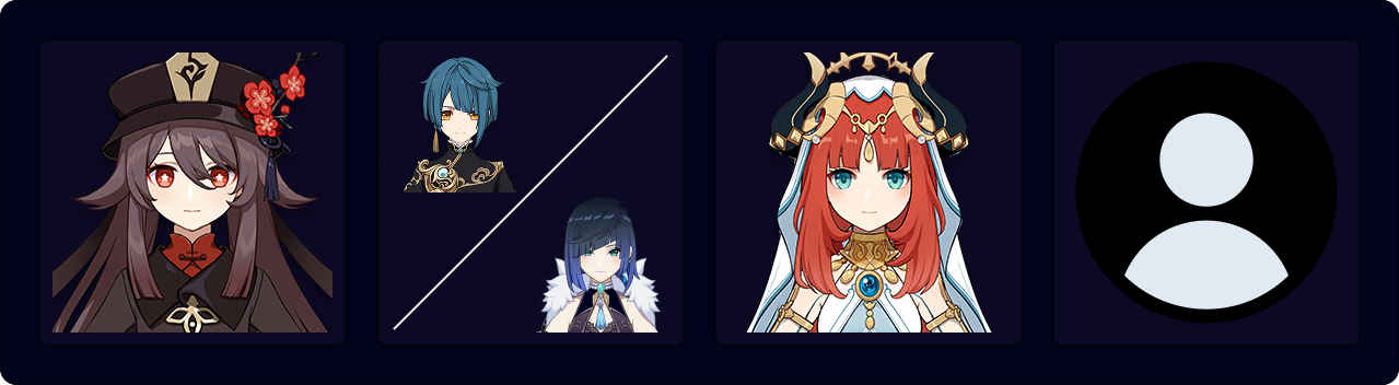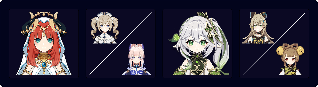 Nilou — Kokomi / Barbara — Xingqiu / Yelan — Nahida