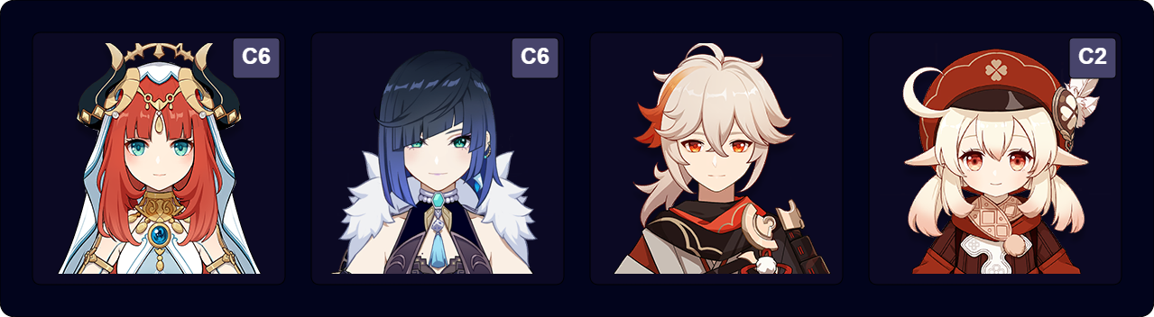 Klee’s DEF Shred from her C2, access to Thousand Floating Dreams, and lack of concern for Energy make her a consistently good support for this team. Unlike when using Xiangling, make sure that at least one enemy has a Pyro aura before using Kazuha’s Burst to make sure that his Burst absorbs Pyro. Since Yelan’s Burst applies 2U of Hydro, consider missing her Burst’s initial hit so that Klee can quickly apply Pyro to an enemy.