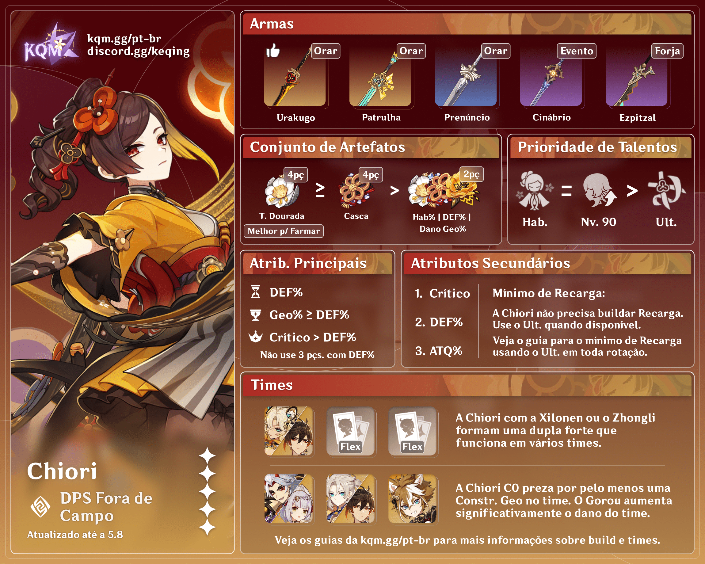 A Chiori forma um ótimo núcleo fora de campo com o Zhongli. Ele oferece 20% de Redução de RES para todos os Elementos, o escudo mais forte do jogo, e uma Construção Geo consistente.