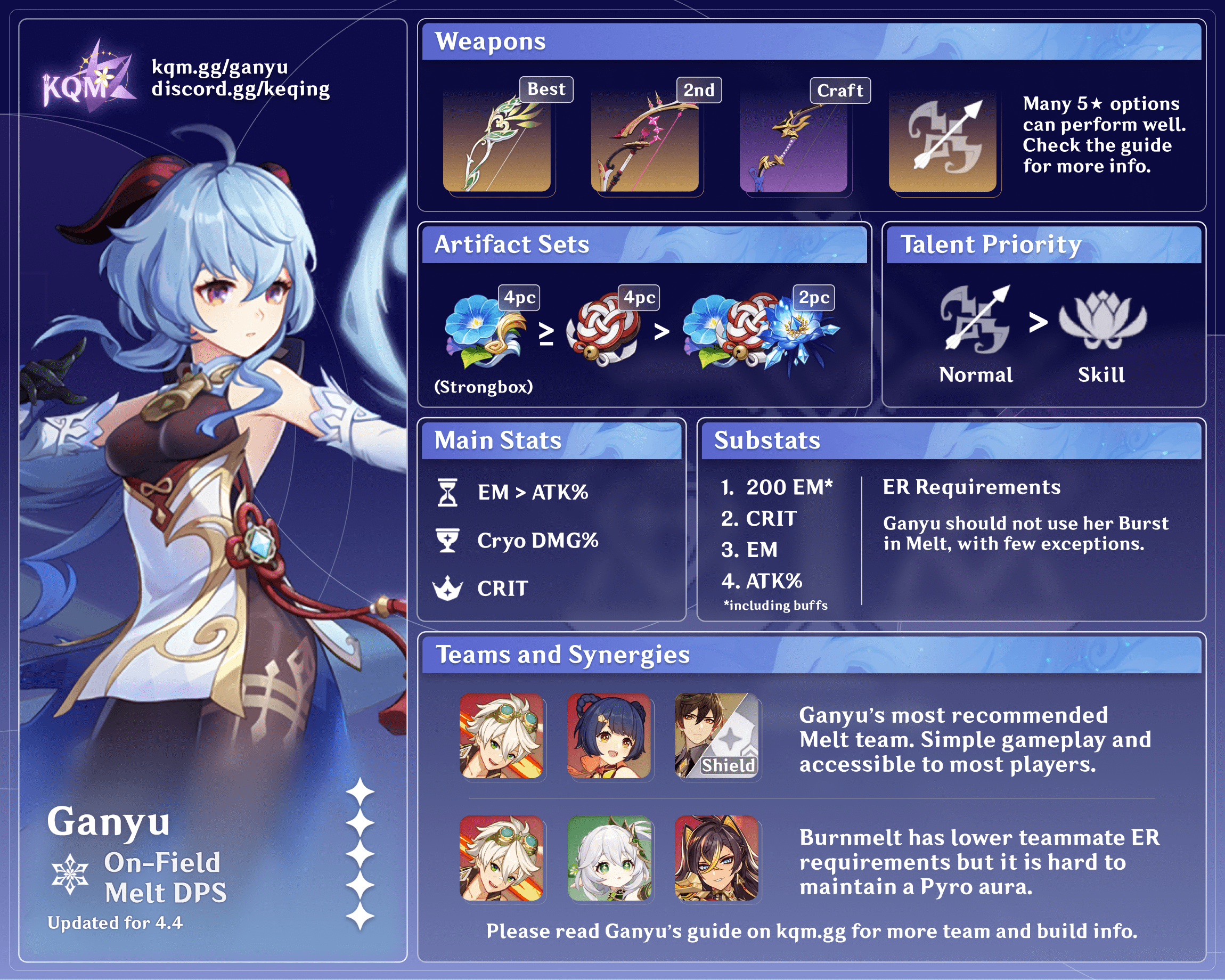 ![]() Forward Melt | Her Cryo application alone is not enough to keep up with most Pyro DPS characters. While technically possible, support Ganyu is not great for enabling Forward Melt (especially with characters like Hu Tao or Xiangling). To address this problem, she can be paired with other Cryo units like Rosaria and Kaeya, who can both reduce her ER requirements and supplement her Cryo application. |