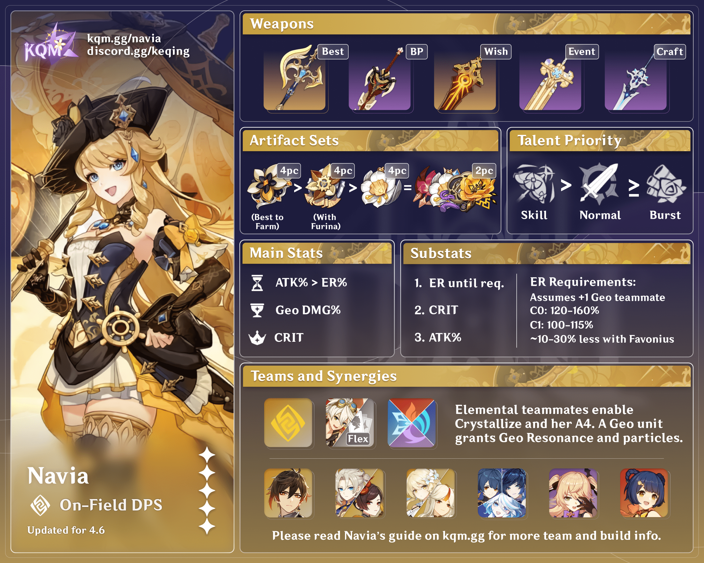 While quickswap teams with on-field Geo units (such as Noelle and Ningguang) are viable, they do not make the best use of Navia’s kit and will not be covered in this quick guide.