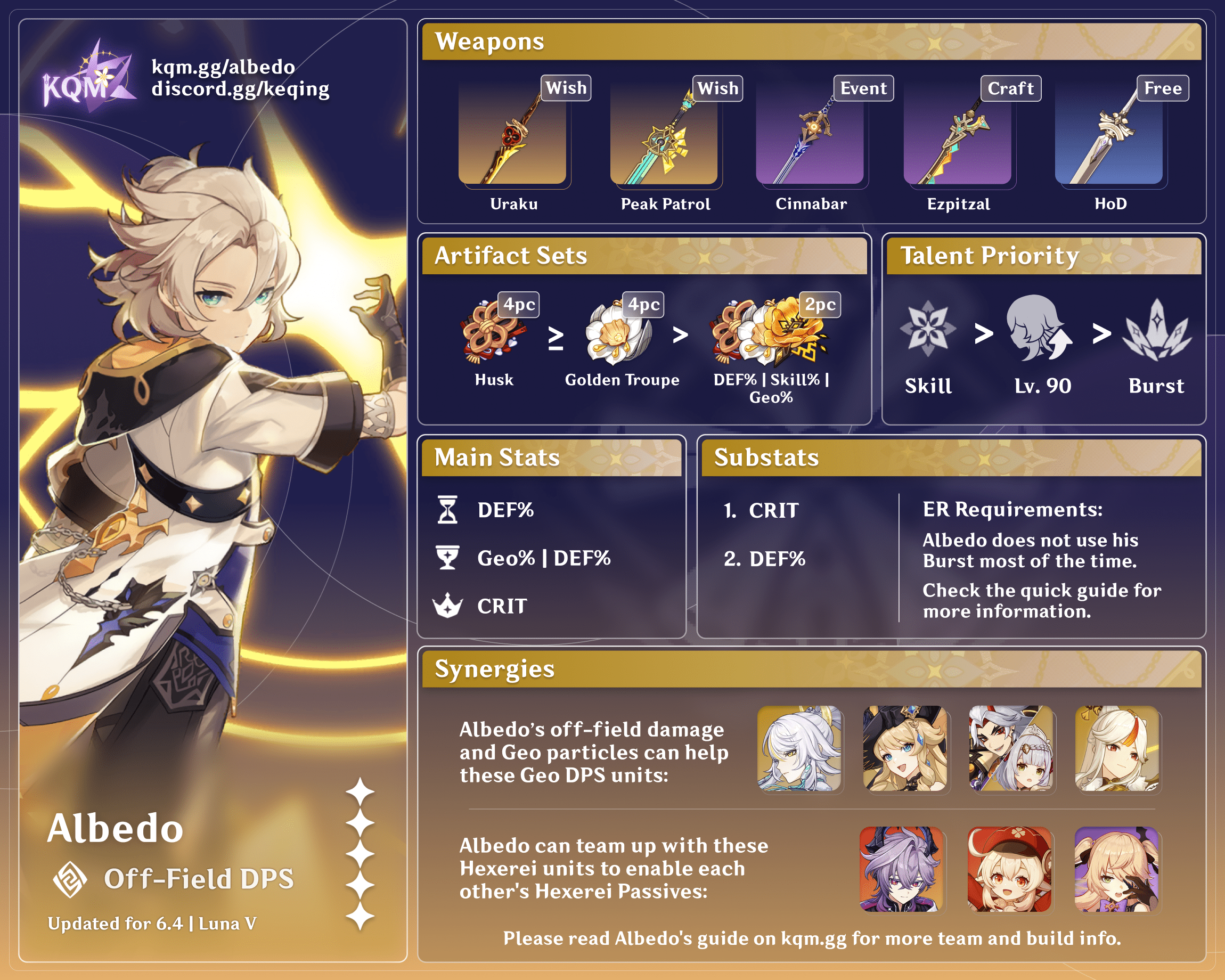 Albedo is a highly flexible off-field DPS in a variety of teams with many different units. He can fit into most teams due to his slow Geo application. On-field DPS units synergize well with his off-field playstyle, but quickswap teams also enjoy his long-lasting Skill. At least one other Hexerei character is required to maximize his damage and buffing and at least one other Geo character activates Geo Resonance.