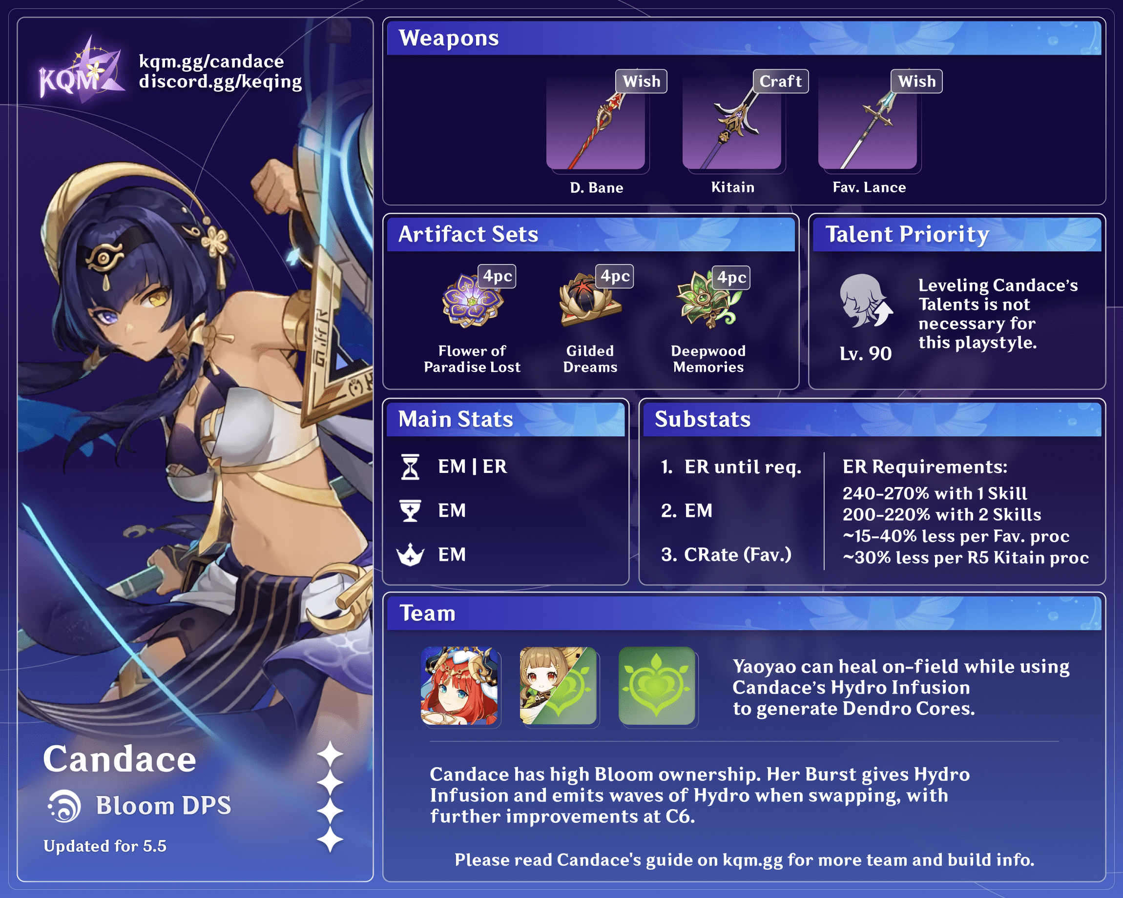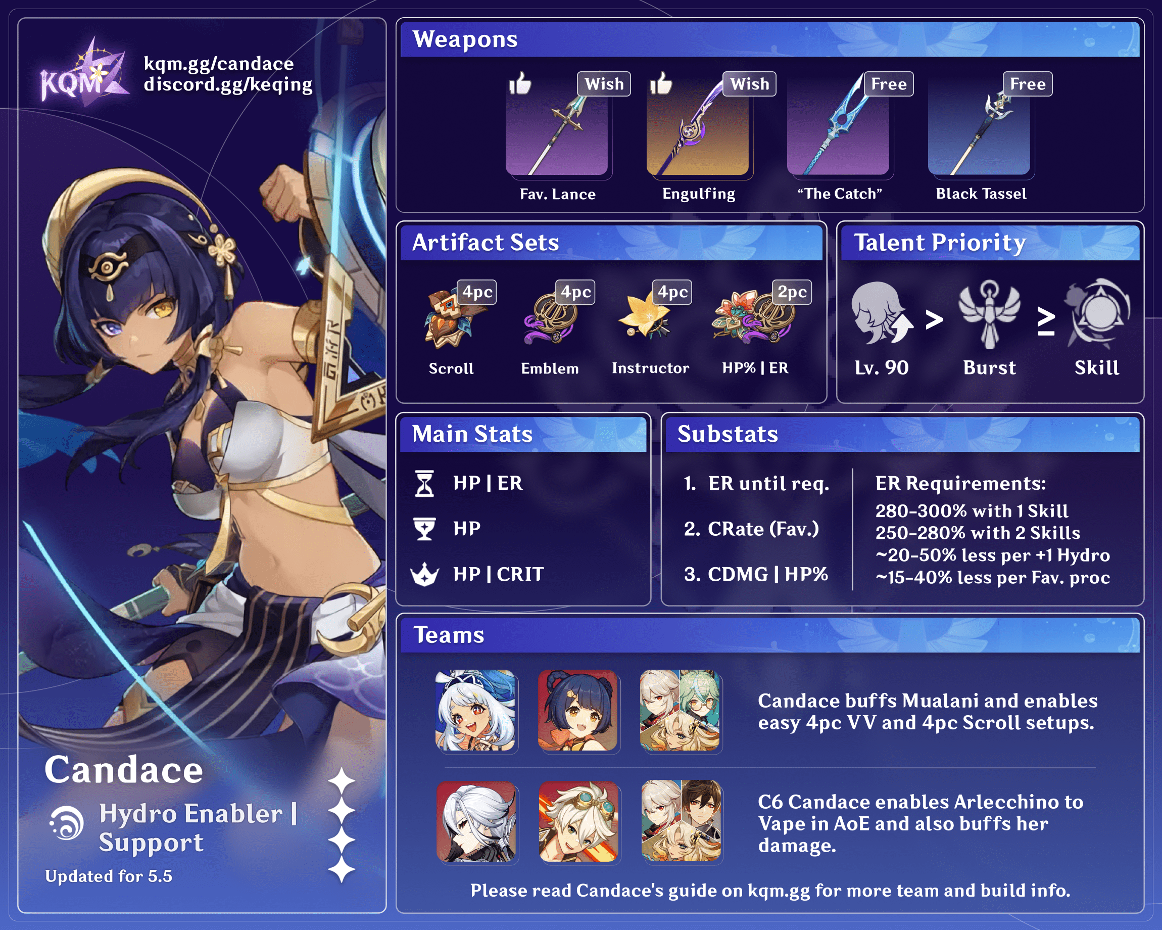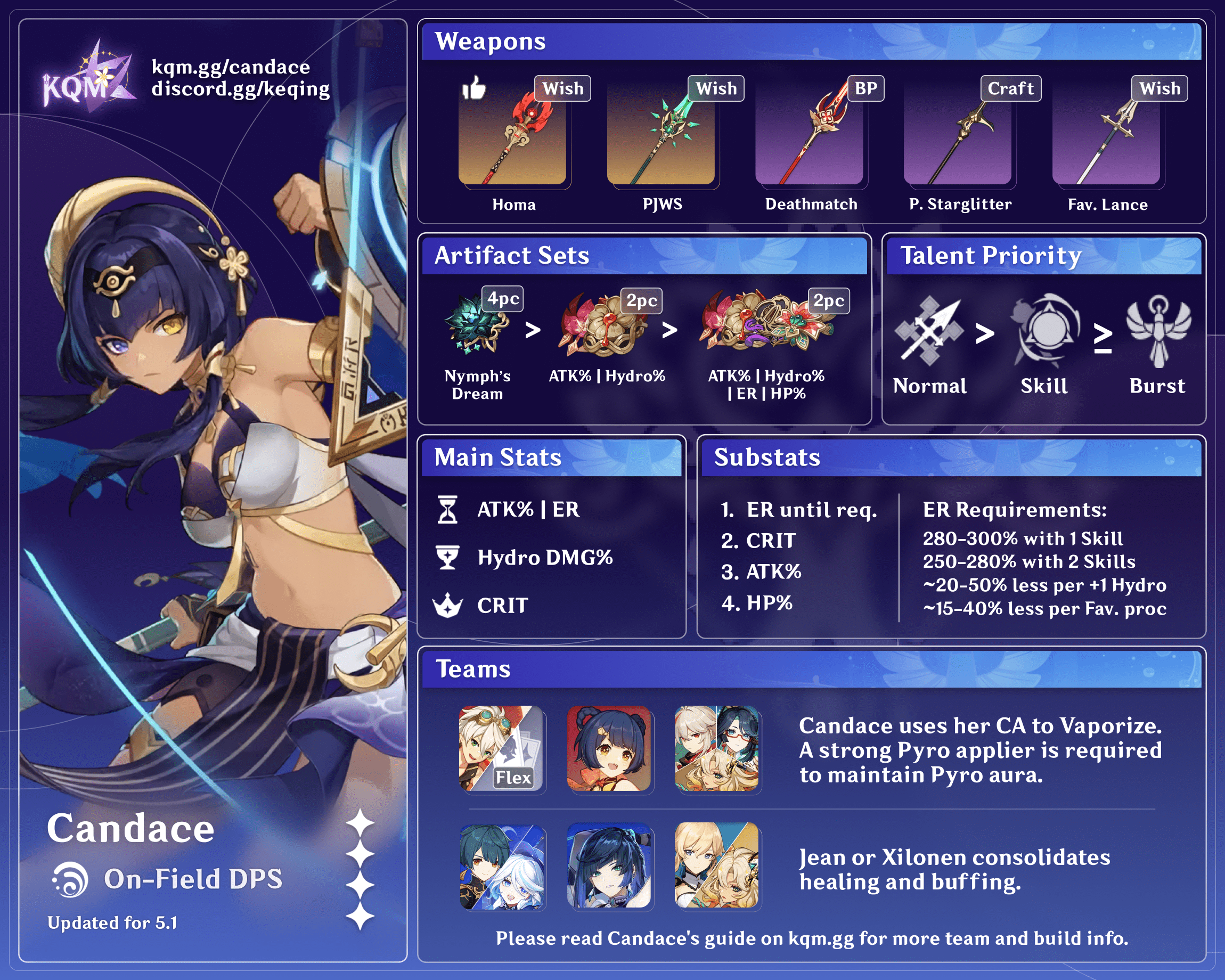 - Candace’s teams usually center around buffing an on-field Normal Attack DPS or providing a Hydro Infusion to melee characters.