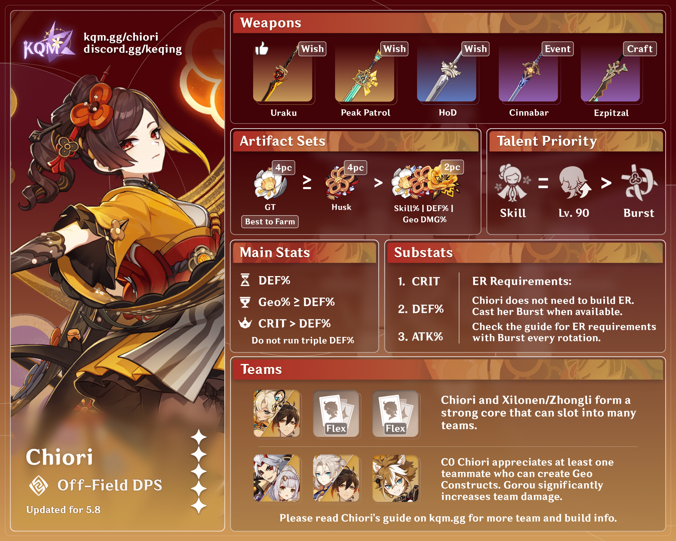 Chiori scales better with DEF stats than with ATK stats. Chiori’s Burst isn’t used every rotation in most cases, so ER% is generally unnecessary.