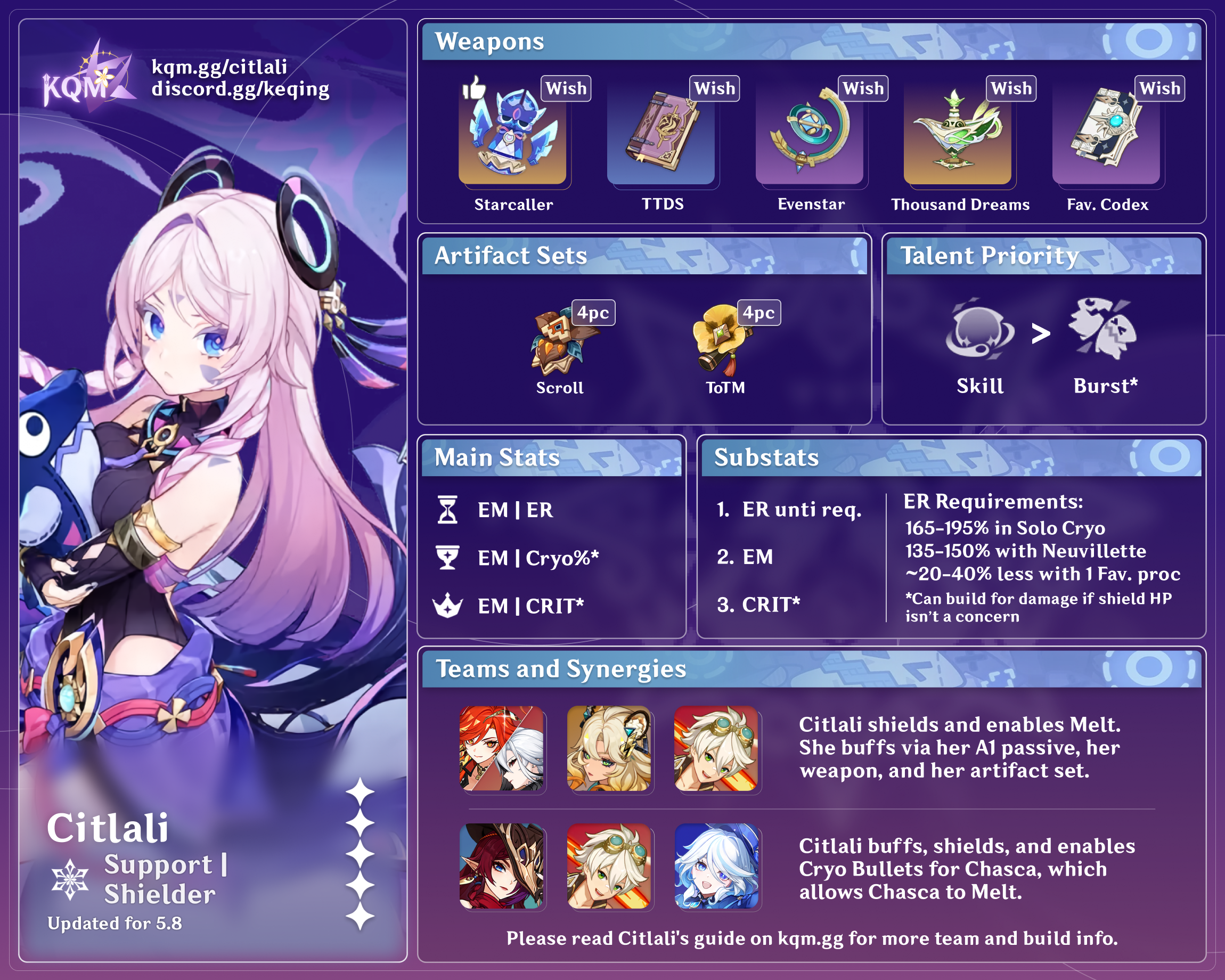 Outside of Cryo damage dealers, Citlali brings 4pc Scroll for Electro damage dealers. For Geo and Anemo damage dealers, she can not trigger 4pc Scroll but nonetheless brings 4pc ToTM and TTDS or other supportive weapons. Although you can often find a better shielder than Citlali for those teams, Citlali is nonetheless viable.