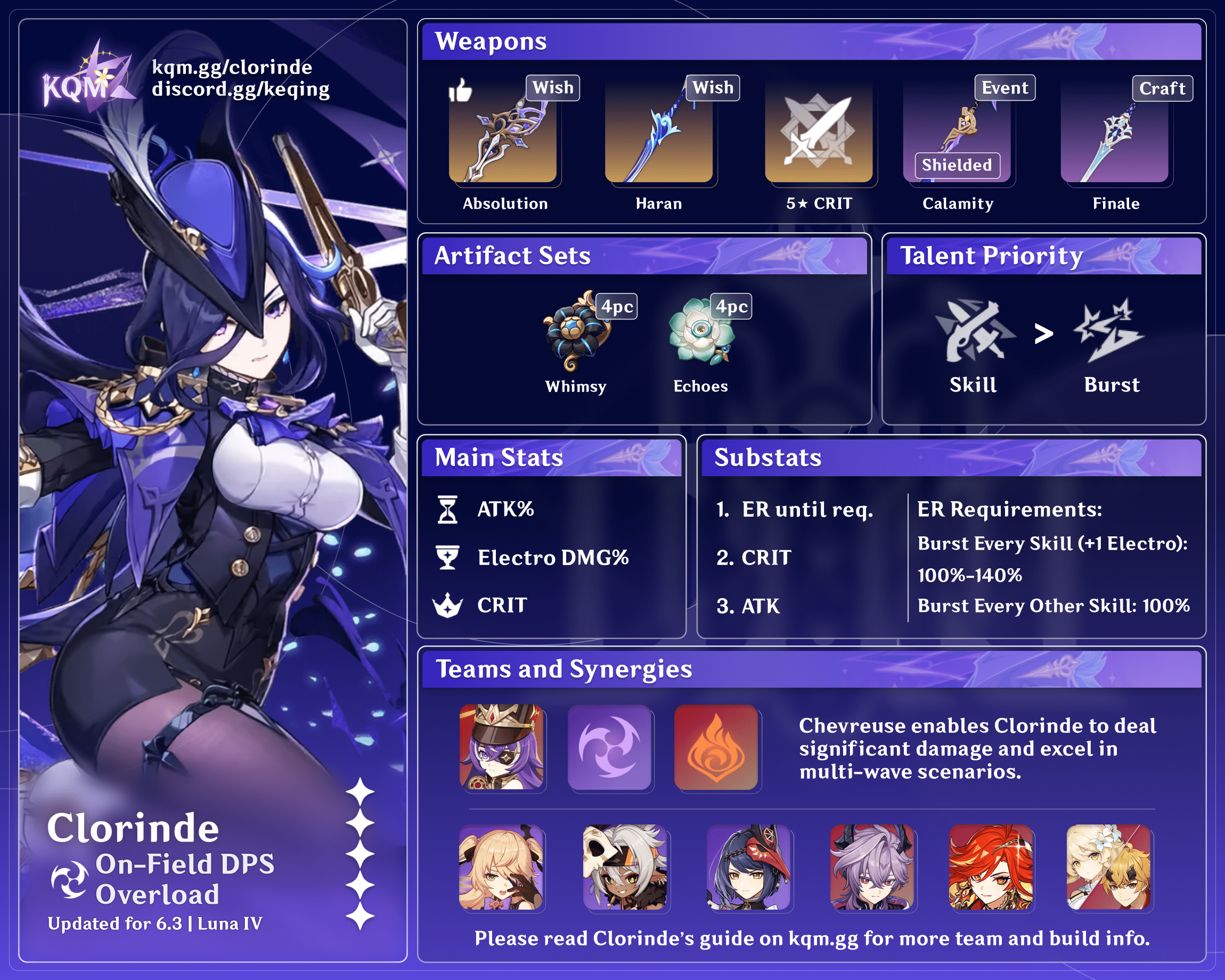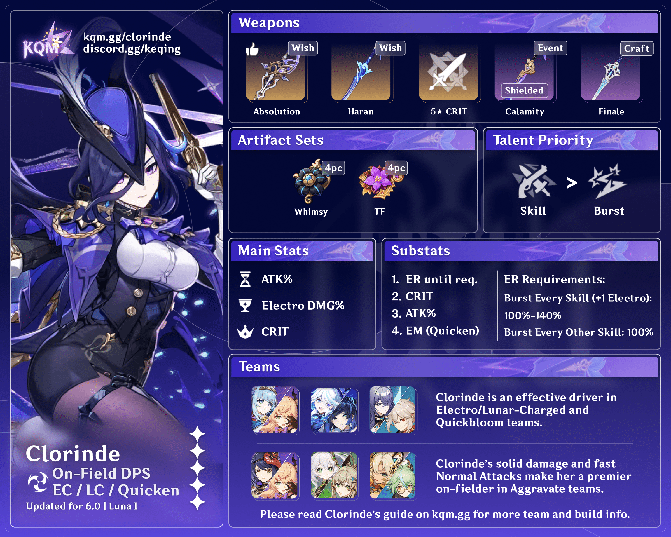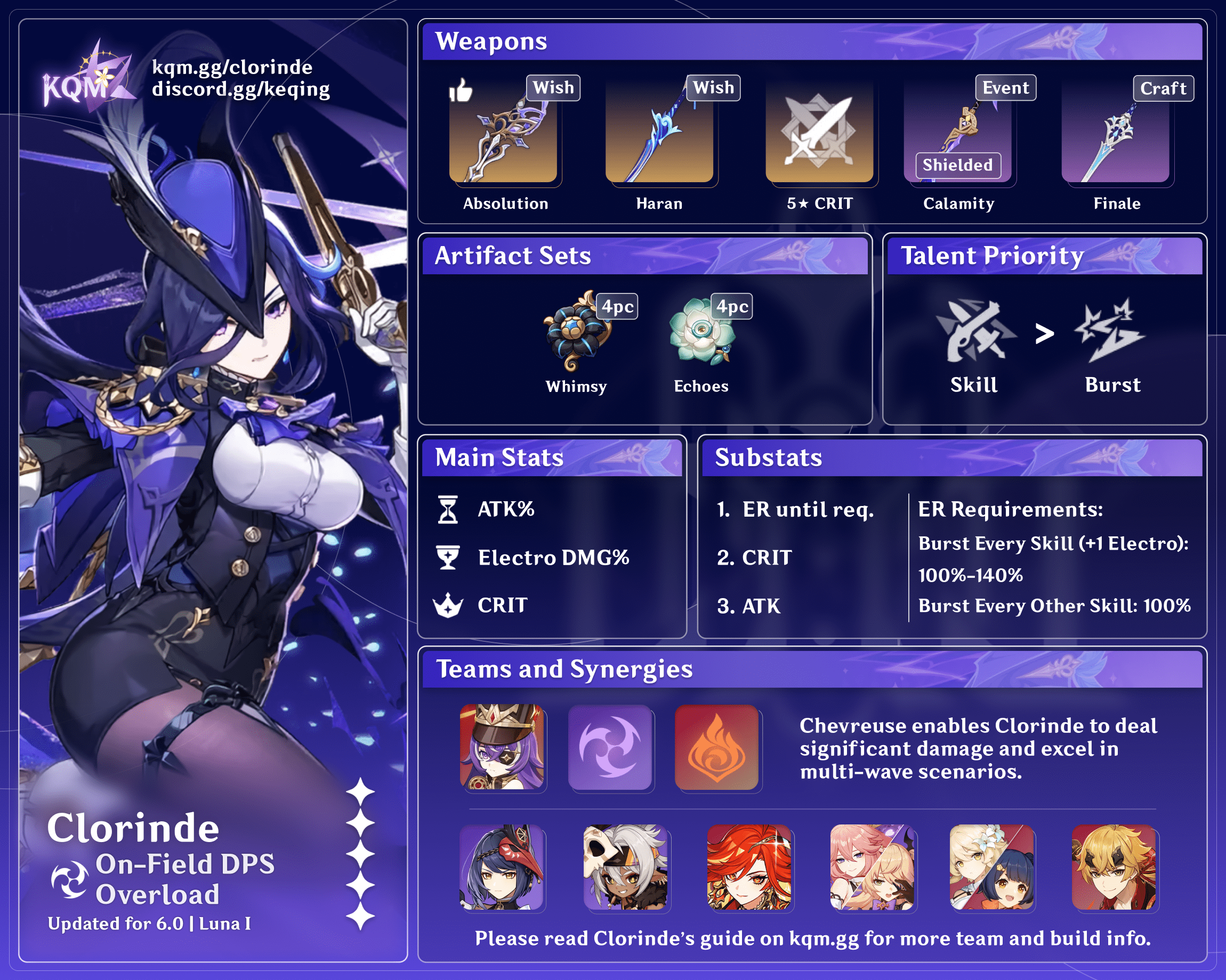 - Clorinde synergizes best with teammates that provide her or the team with powerful offensive support (e.g. Kazuha or Chevreuse) or meaningful personal damage (e.g. Fischl or Mavuika), without causing delays in activating Clorinde’s Skill. As such, her strongest teams tend to favor 16s rotations (or 25s if using 4pc Thundering Fury in Quicken-based teams).