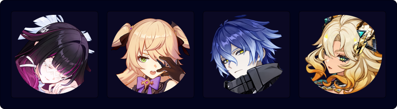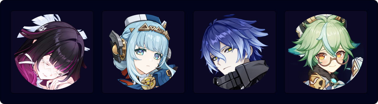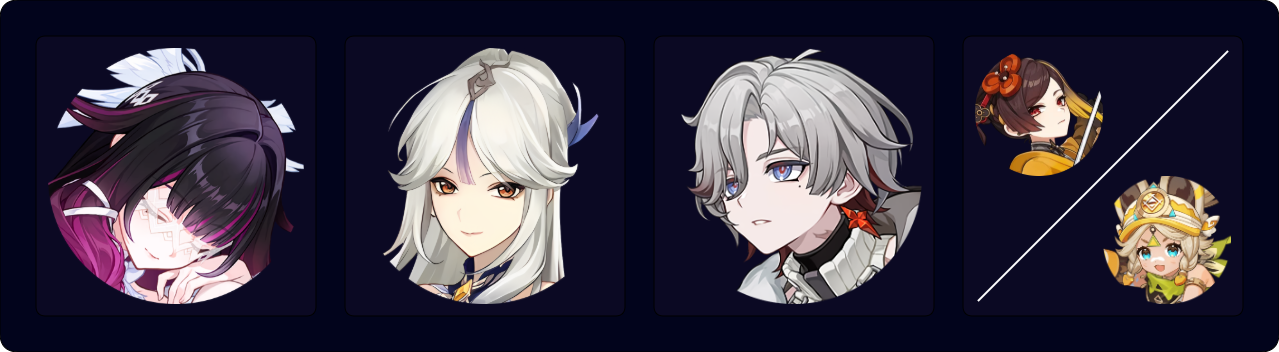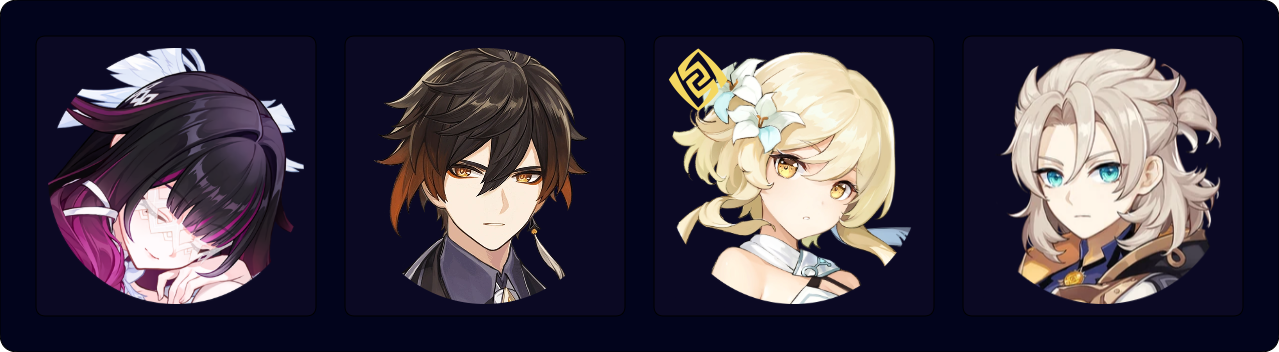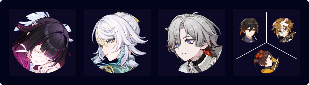 The standard Triple Geo team for Zibai. While Zhongli, Gorou, and Chiori provide similar damage output, Zhongli is the recommended option for general use because of his tanky shield. However, players can still get some defensive utility through Columbina’s Prototype Amber or her C1.