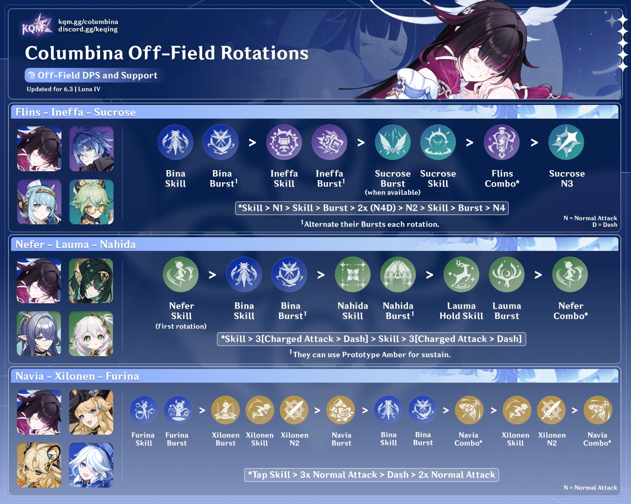 (Nefer N1)¹ > Columbina E Q > Nahida E Q > Lauma hE Q > Nefer E 3[CD] E 3[CD] (Q)²