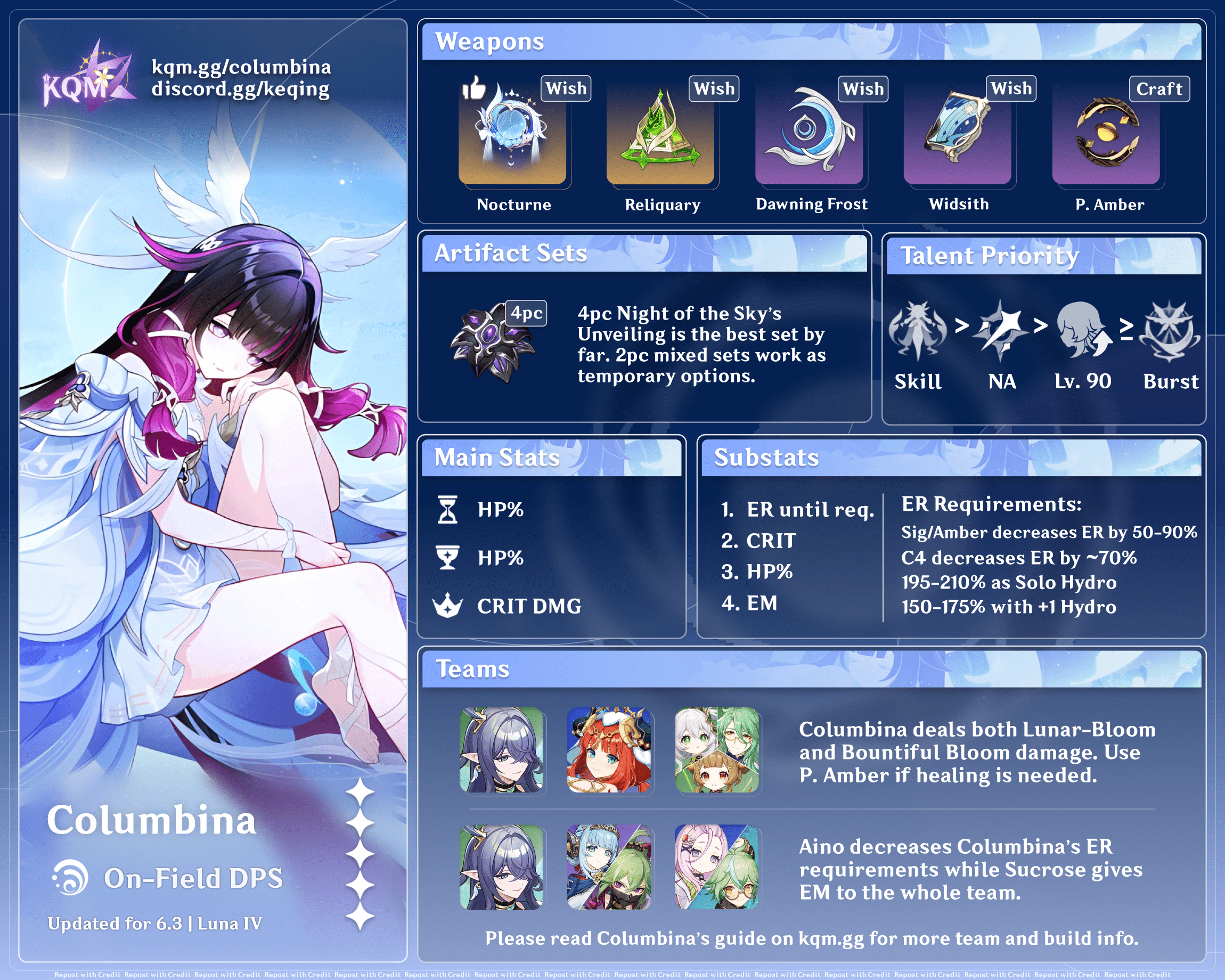 ![]() Aino | Aino can be used as an F2P Ascendant Gleam partner for Columbina. She provides additional Hydro application for the team, helps Columbina with her ER requirements, and offers appreciable buffs from her C1 and C6. |