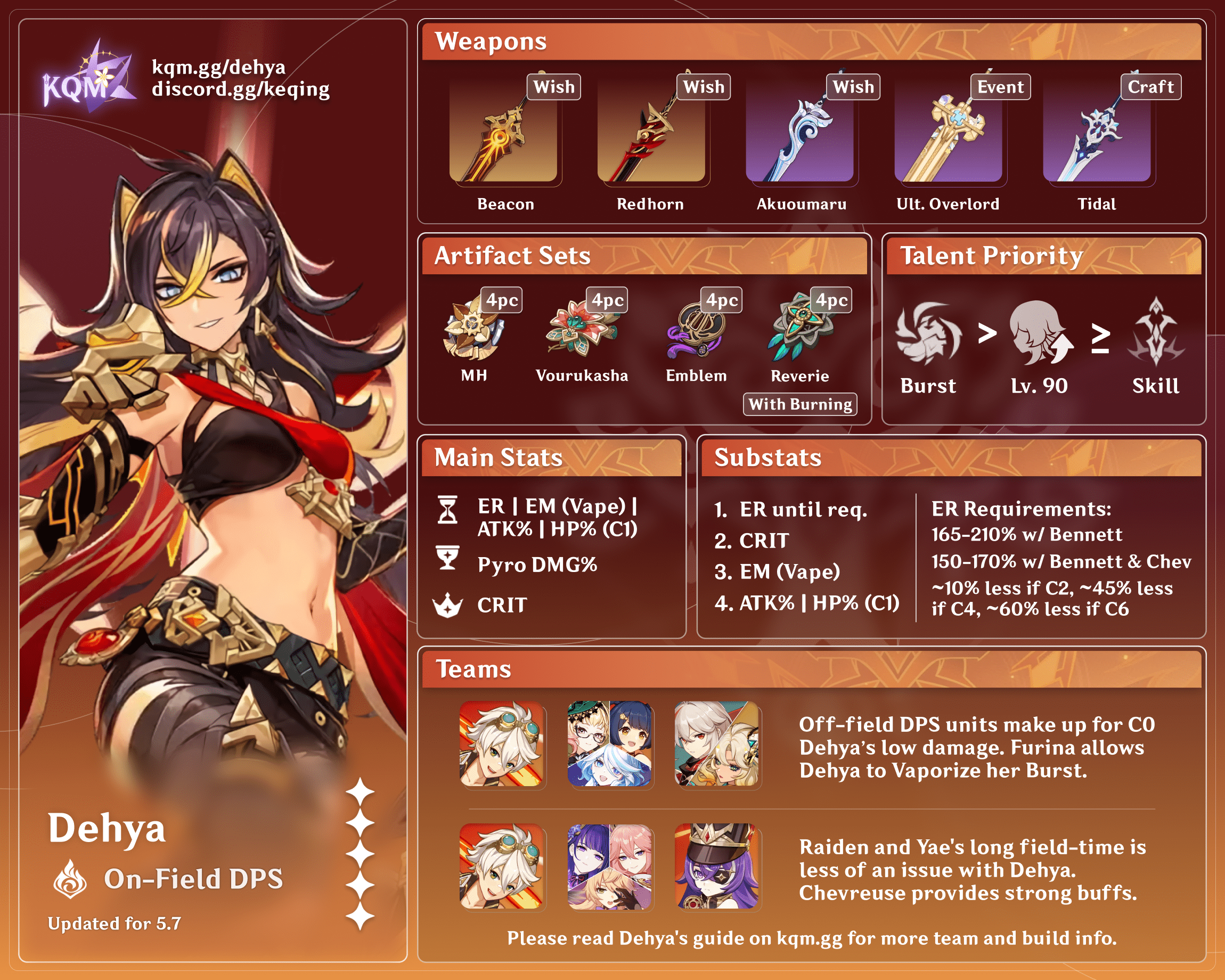 Dehya’s on-field ER requirements are immensely high, as she needs to Burst every rotation. It is always recommended to run Dehya with other Pyro characters to provide her with additional particles.