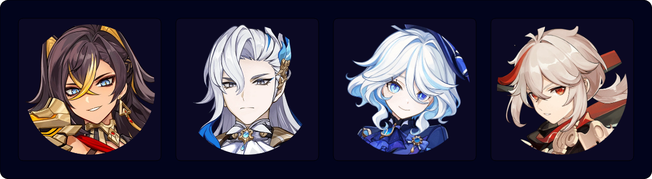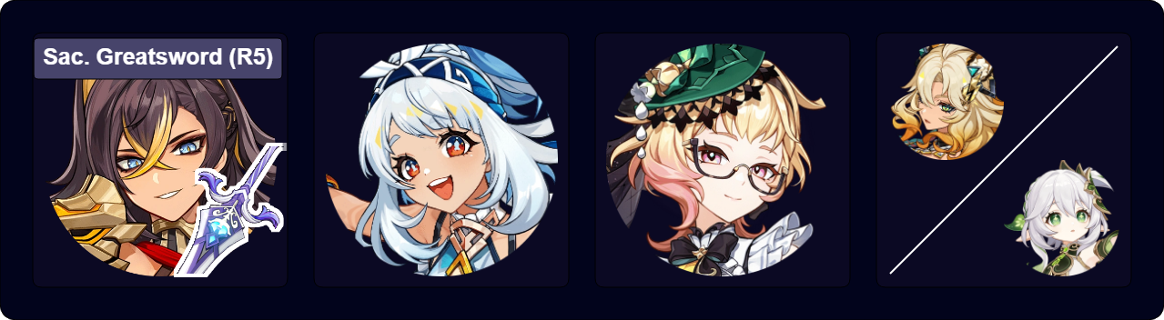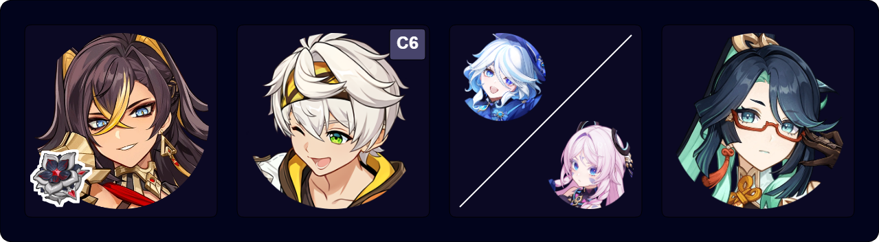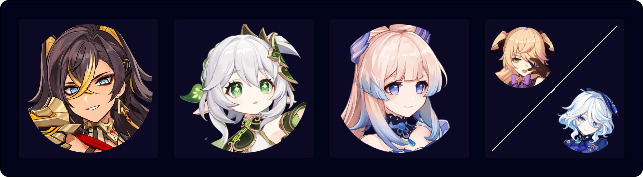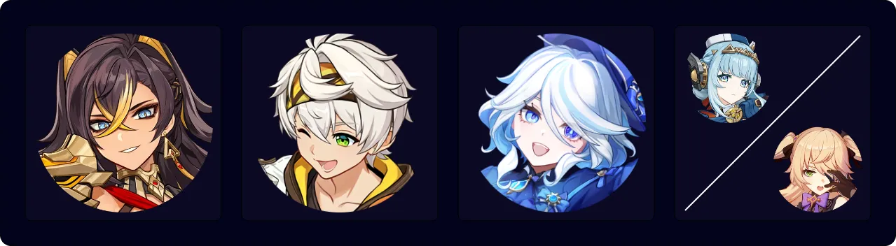 A Burgeon team that focuses less on maximizing Dendro Core damage and more on other teammates’ damage. Kokomi serves as a healer to both counteract self-Burgeon damage and Furina’s HP drain. Fischl can sometimes trigger Hyperbloom through her A4 procs.