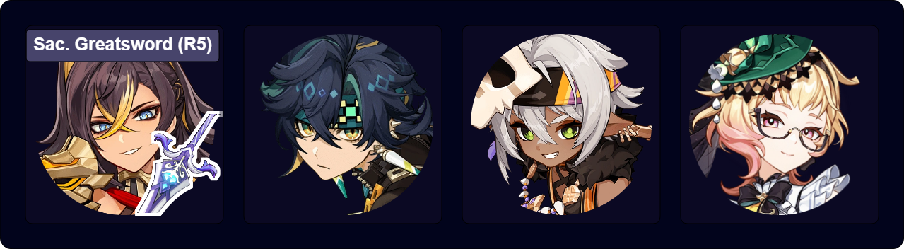 When paired together, Escoffier and Citlali provide enough Cryo application for Dehya to Melt all her Elemental Burst hits in single-target situations. Escoffier herself can Melt some Skill hits during setup phases, leading to high personal damage. Citlali buffs both Dehya and Escoffier with a DMG% buff via 4pc Scroll and provides Pyro RES Shred. Her shield reduces the reliability of 4pc MH and 4pc VG; however, Dehya’s high Energy needs make 4pc Emblem desirable regardless.