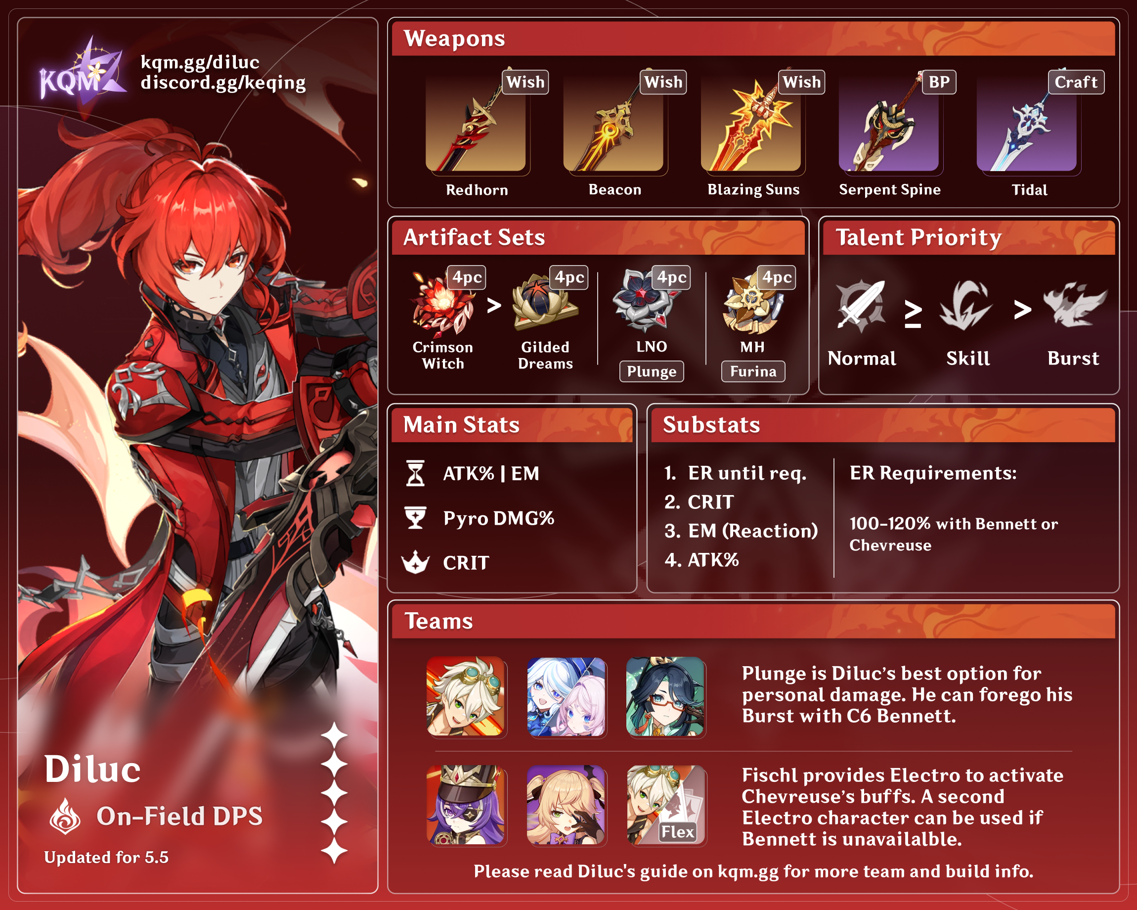 Diluc is a 5-star Pyro Claymore character in Genshin Impact who excels as an on-field DPS in a variety of teams. Learn about Diluc’s best builds, Talent priority, best weapons, best artifacts, and best teams in this in-depth and updated review.