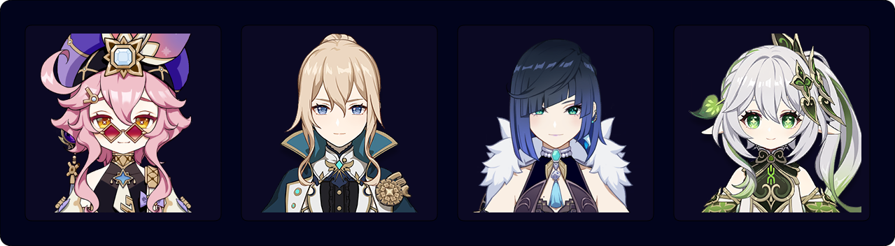 ![]() Nahida | Nahida is the prime option for both on-field and off-field Dendro application due to her personal damage and consistency. Notably, an on-field Nahida paired with an off-field Hydro enabler would allow the team to work well in both single-target and AoE. |
