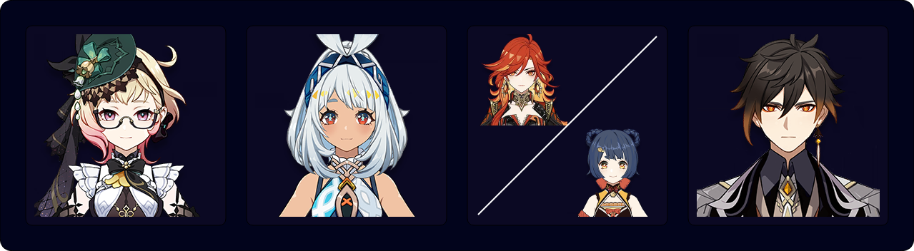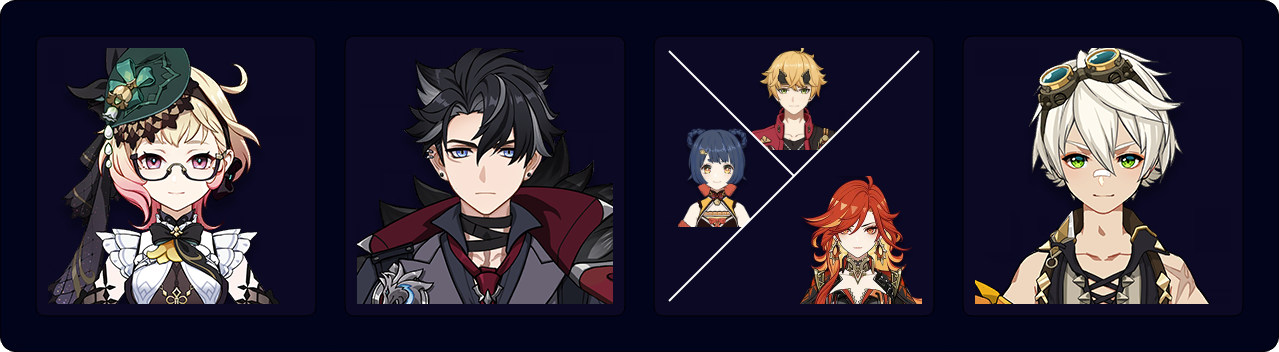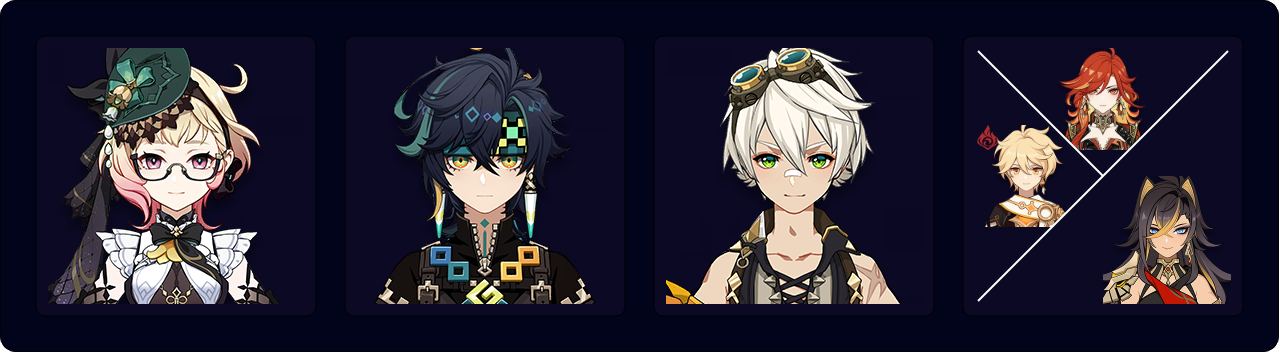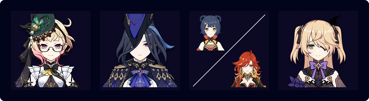 Clorinde acts as an on-field DPS while her teammates deal additional damage from off-field. Clorinde’s self-healing can compensate for the lack of a dedicated healer. Xiangling uses her Burst every other rotation to shorten rotation length and significantly reduce her ER requirements. Mavuika provides buffs to every teammate via 4pc Scroll and similarly to Xiangling, casts her Burst every other rotation for tighter rotations.