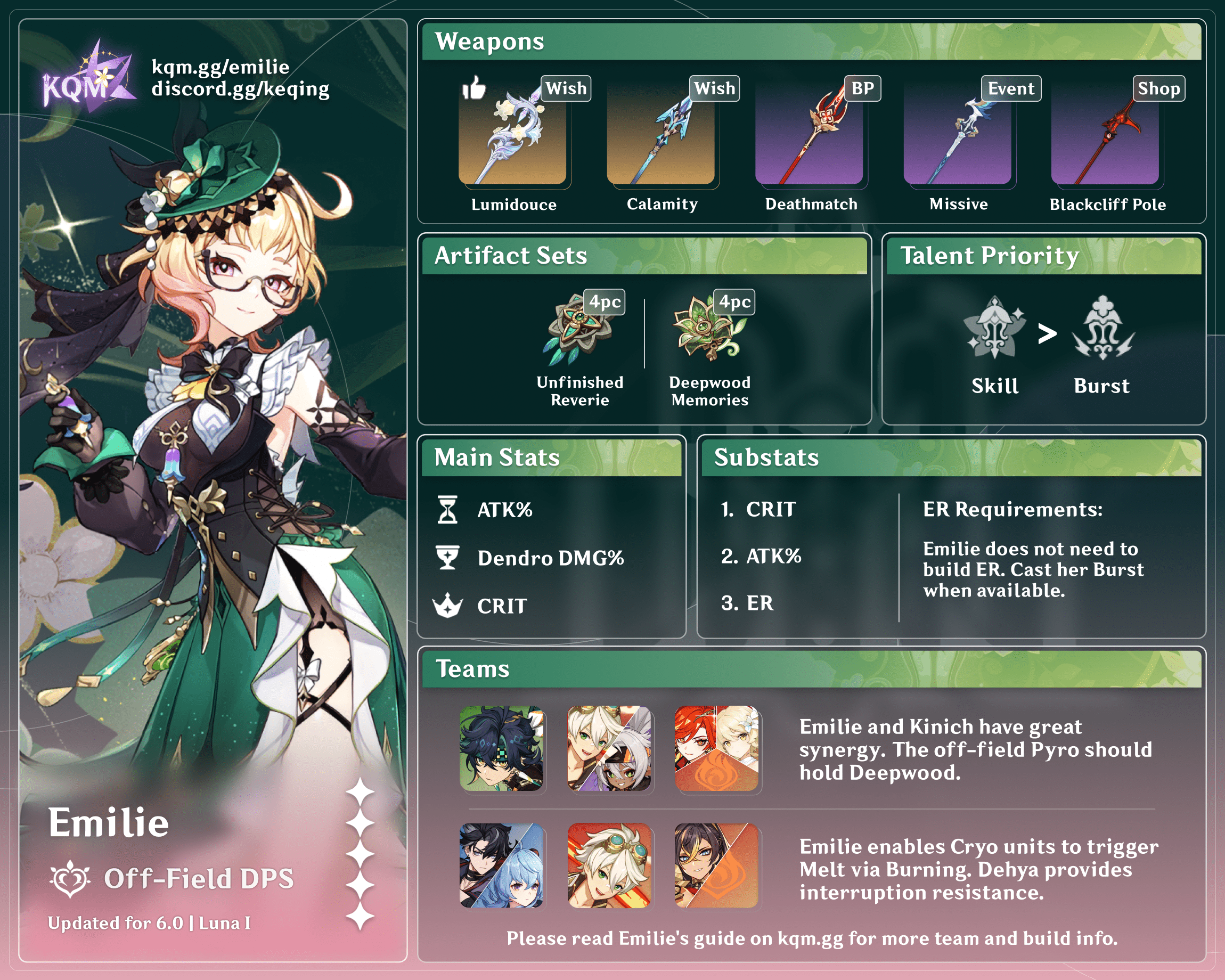 Due to the above factors, Emilie can often deal the majority of team damage; this makes it viable to run 4pc Tenacity of the Millelith and/or 4pc Deepwood Memories on Furina and/or Xiangling.