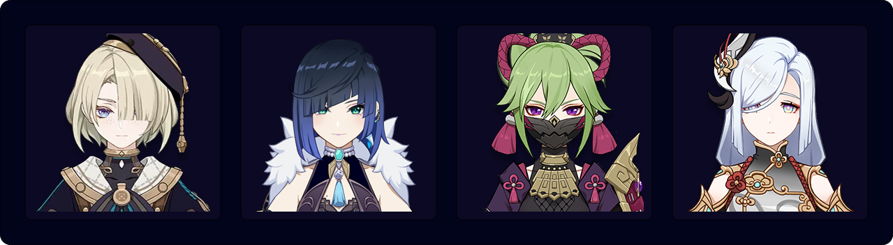 Nahida provides strong off-field Dendro application. Xingqiu deals great Hydro damage and produces Dendro Cores. Kuki Shinobu serves as both a Hyperbloom trigger and a healer.