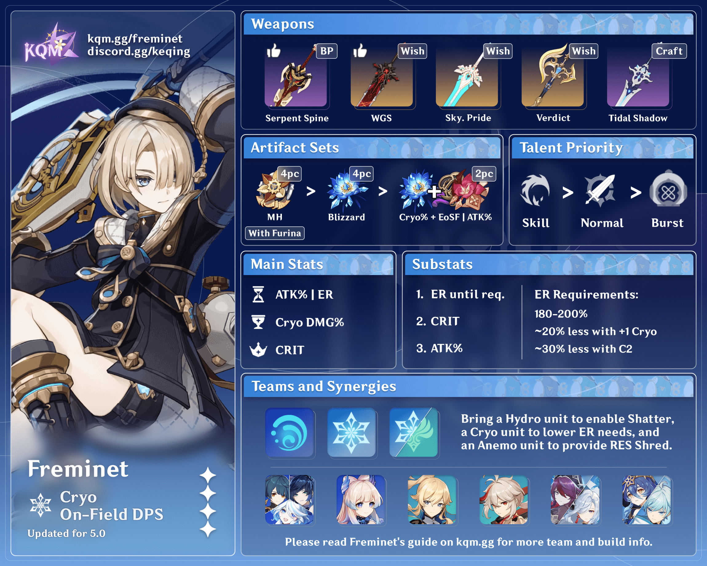 - Favonius weapons are highly recommended on your other teammates to lower Freminet’s ER requirements, especially at C0–C1.