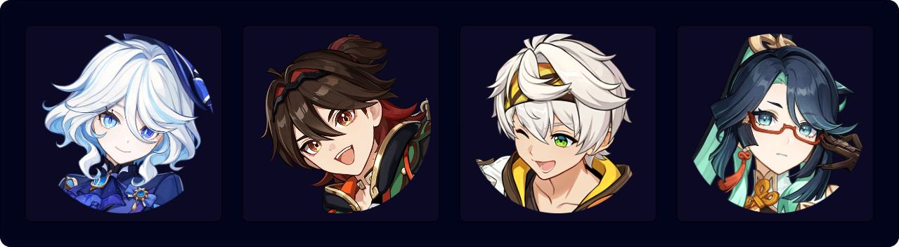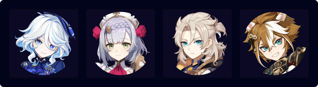 This Triple Geo team enables Noelle and Albedo to deal substantial AoE damage, as they benefit from Geo Resonance, Furina’s Burst, and Gorou’s various buffs. Noelle’s flexible field time allows Gorou to use his Skill off cooldown to battery Noelle and lets Albedo reposition his Solar Isotoma if needed. Gorou should equip 4pc Exile and Favonius Warbow (along with a CRIT Rate Circlet) to drastically lower the team’s ER requirements. It is also possible to replace Albedo or Gorou with other flex units such as Fischl or Yelan.