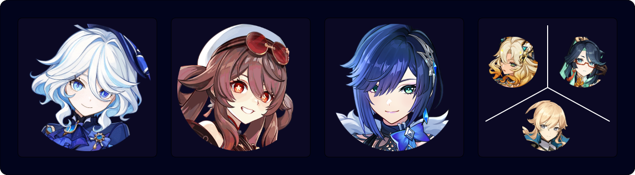 Furina and Yelan provide enough Hydro aura for Hu Tao to consistently trigger Vaporize. Consistent healing causes Hu Tao to remain above 50% HP; this prevents her from getting full value out of her A4 Passive and Staff of Homa, though Furina’s teamwide buff and off-field damage compensate for this.