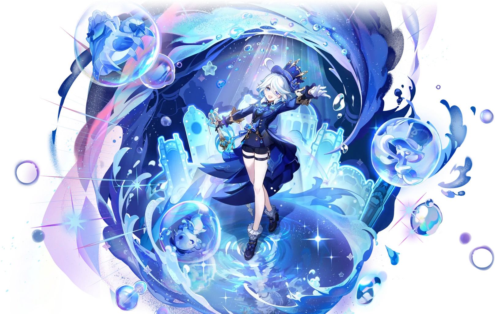 Foaming bubbles like celebrants shall dance, dealing AoE Hydro DMG based on Furina’s Max HP and summoning 3 Salon Members: the Ball Octopus-shaped Gentilhomme Usher, the Bubbly Seahorse-shaped Surintendante Chevalmarin, and the Armored Crab-shaped Mademoiselle Crabaletta.