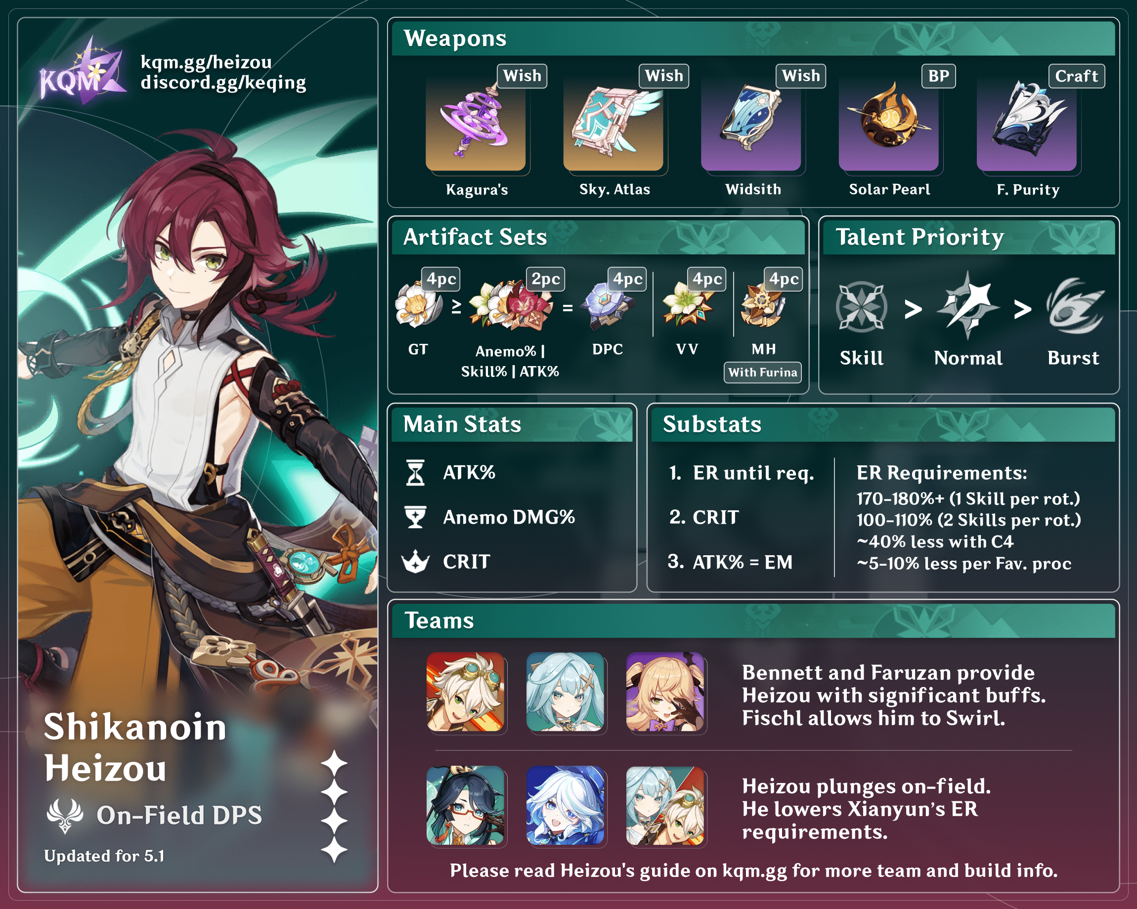 Heizou can be a support with 4pc Viridescent Venerer and a weapon like Thrilling Tales of Dragon Slayers or Hakushin Ring. He can use a quick sequence of attacks to trigger Swirls and obtain max stacks for his Skill. In some teams, especially when using support weapons, he can forgo his full combo, yielding field time to another DPS unit so they can maximize team buffs.