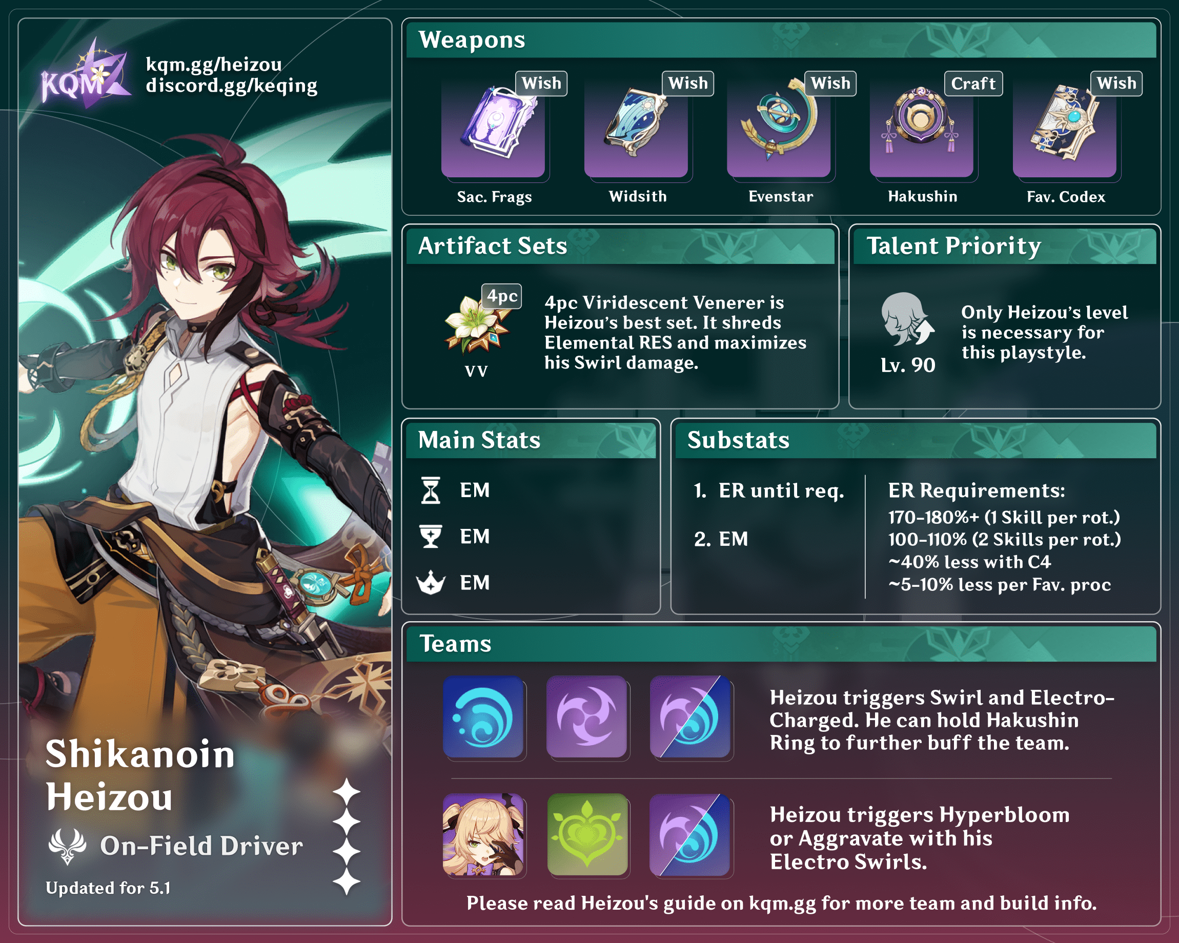 Heizou’s EM build is primarily used when he serves as an on-field driver in Electro-Charged or Hyperbloom teams.