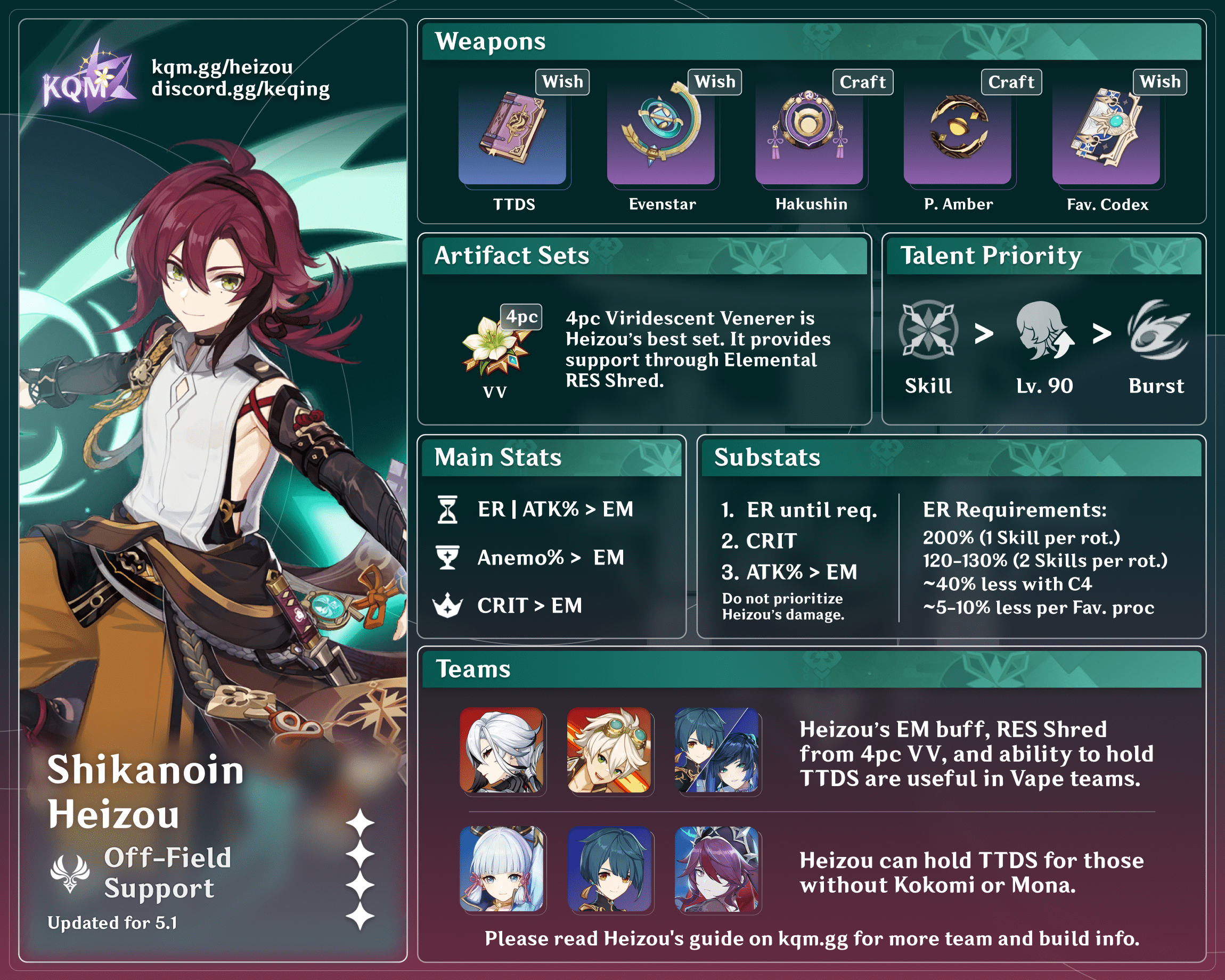 Heizou can effectively support an on-field Pyro DPS in Reverse Vape teams due to his EM buff and ability to hold 4pc Viridescent Venerer as well as Thrilling Tales of Dragon Slayers.